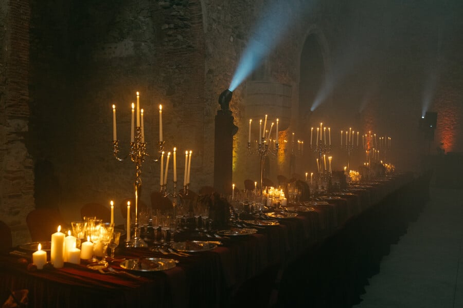 Rob: From the beginning, we knew the destination had to be Spain. Karla’s Mexican heritage made it important for us to host in a Spanish-speaking country. Over the years, we’ve worked and vacationed in Spain, falling in love with the culture—and of course, the food. When we discovered Monestir Sant Salvi, we knew it was the perfect venue. It had the uniqueness, character, and “wow” factor we wanted to share with our guests from around the world. Karla’s love of fantasy shaped the design of the monastery with a royal, period-inspired aesthetic—contrasted with a modern flair. Think medieval drama with cinematic elegance.
