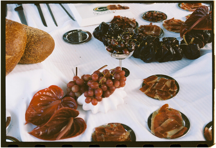 Karla: At first, we envisioned a white and cream palette, but eventually we introduced a bold and opulent oxblood velvet. We had four rolls of the most exquisite fabric shipped to Girona, and it became a signature element of the day.
