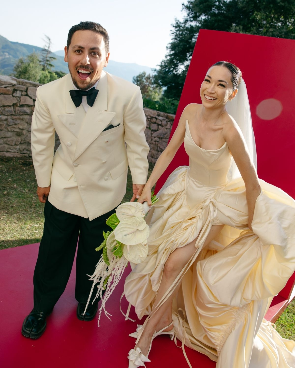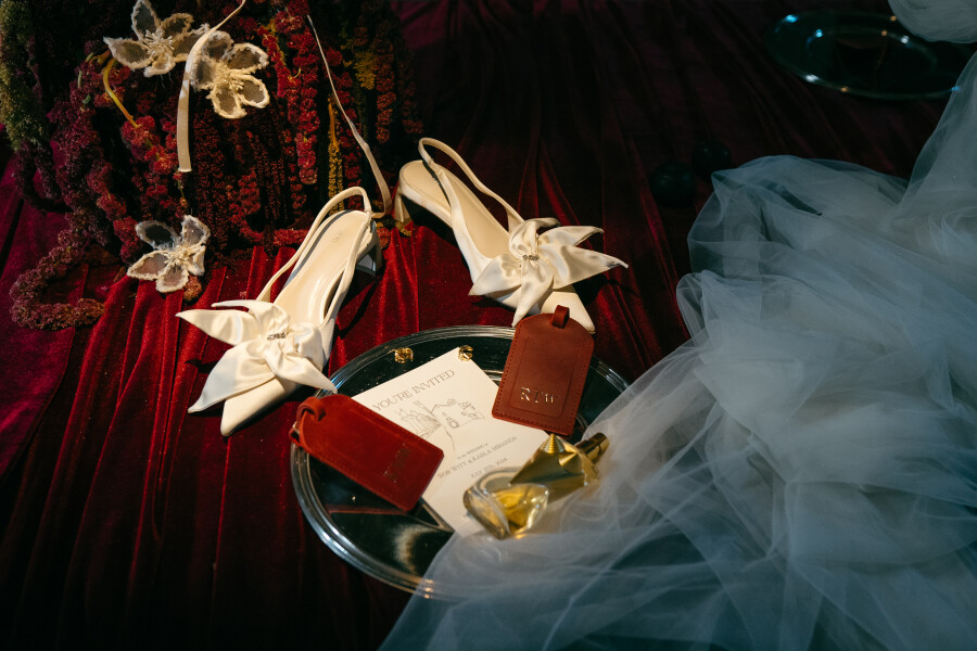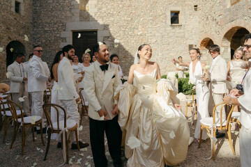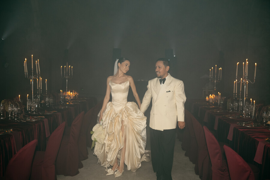 Rob and Karla’s wedding was a cinematic masterpiece of design, where history, fantasy, and personal storytelling merged into one unforgettable celebration. Set against the dramatic backdrop of Monestir de Sant Salvi in Spain, their special day unfolded like a grand production – every element deliberate, every detail layered with meaning. Inspired by the monastery’s medieval architecture, Karla infused the design with a period aesthetic brought to life with modern flair. The transformation was striking: oxblood velvet draped across banquet tables, custom red leather luggage tags embossed with each guest’s initials, and lavish candelabras flickering against stone walls. Karla’s modular gown, evolved throughout the evening into multiple looks, while Rob’s fashion-forward ensemble of Maison Margiela mirrored the same balance of modernity and tradition. The celebration was captured through the lens of Cybele Buffile, whose artistry preserved every layer of cinematic detail, from the monastery’s sweeping grandeur to the intimate, candid moments of joy.