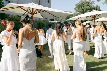 Rob: Fabric is powerful. The deep Catalan red was both a nod to our host country and a way to heighten the cinematic tone of the event. The velvet was draped across two long banquet tables and even the DJ booth, seamlessly tying the space together. When guests entered the monastery, they were met with an unexpectedly lavish tablescape. Each silver plate was set with a custom red leather luggage tag embossed with the guest’s initials and a personal photo inside. Tall silver candelabras, crystal glassware, and burgundy fruits completed the look.