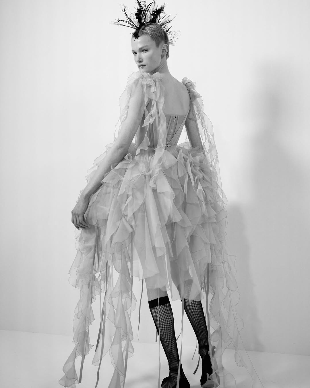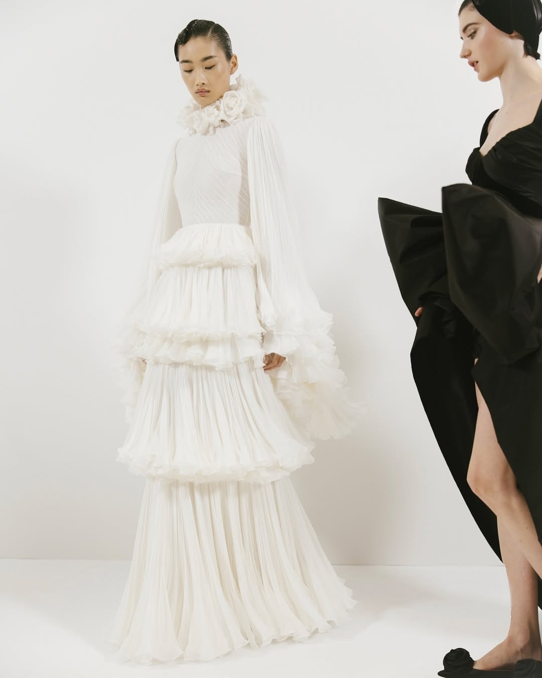 Somewhere between period drama and high fashion, ruff collars are making an opulent return. These voluminous, pleated neckpieces—straight out of the Elizabethan era—are proof that castlecore is here to stay. From delicate, lace-trimmed versions to bold, exaggerated structures, these collars frame the face with a touch of aristocratic grandeur. Whether paired with a sleek, minimalist gown for contrast or enhancing a fully regal ensemble, this look is for the bride who wants to feel like she stepped out of a Renaissance painting.