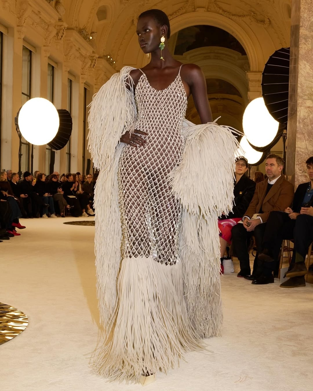 Not quite full-feathered extravagance, but rather a whisper of softness—this season’s feather trend is all about delicate, airy textures. Wisps of weightless plumes peek out from sleeves, hemline trims, and even floating along necklines, creating a dreamy, barely-there effect. The look is playful, romantic, and just the right amount of ethereal. Think less Las Vegas showgirl, more heavenly soft touches of couture.