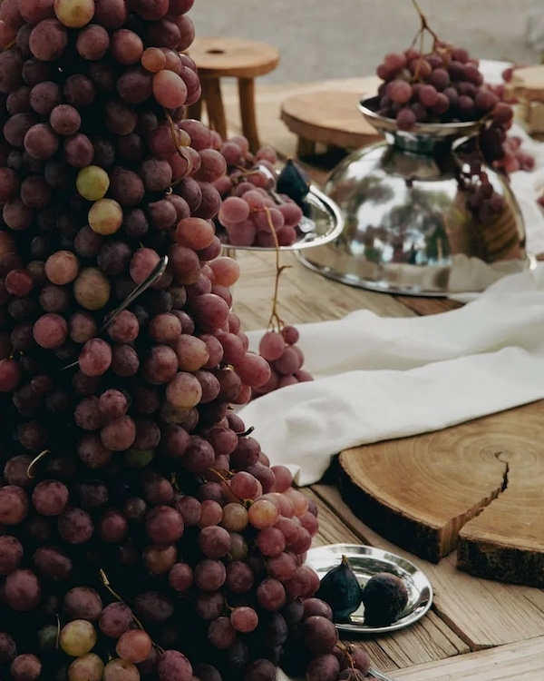 During our reception, we started with a cocktail hour in the front part of the garden, where we had a live harpist playing for the first two hours. For the cocktail table décor, El Amor Productions collaborated with Pipeta, an innovative studio specializing in creative culinary experiences. Together, we designed a variegated artistic installation featuring grapes, ribbons, and alpaca tableware—a choice that complemented the cheese table beautifully.