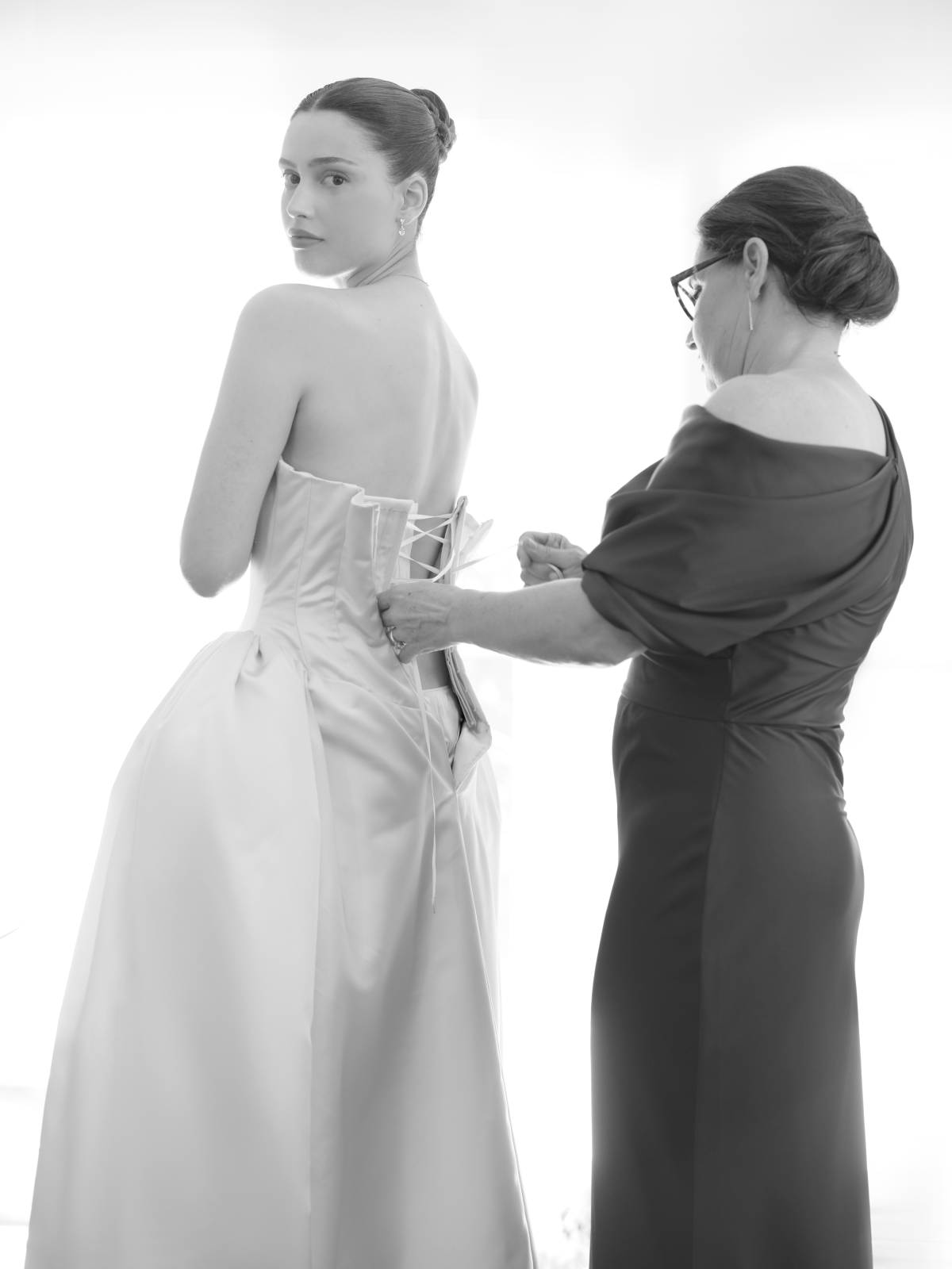 My first dress was a custom creation from Avec Amour, designed by me and made by my former pattern-making teacher, Mari Carmen Francés López. I wanted something simple that I would still love 30 years from now, while also reflecting my style 100%. The volume was inspired by my favorite movie, Sofia Coppola's Marie Antoinette, and I chose a champagne-colored silk duchesse fabric—I’ve always disliked how pure white looks on me. The shoes, inspired by ballet flats, were from the emerging brand Madomorpho, a nod to my years as a ballerina during childhood. Ballet is something I always carry with me.