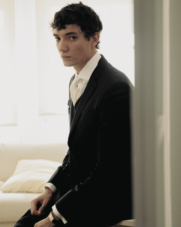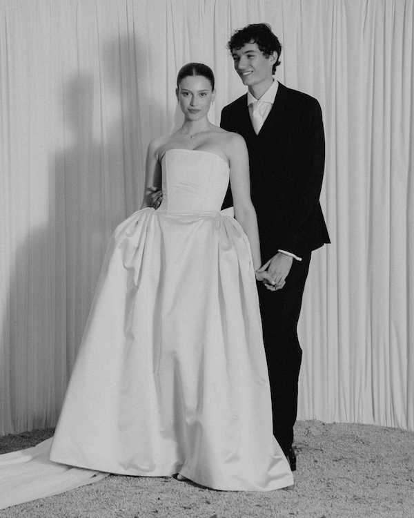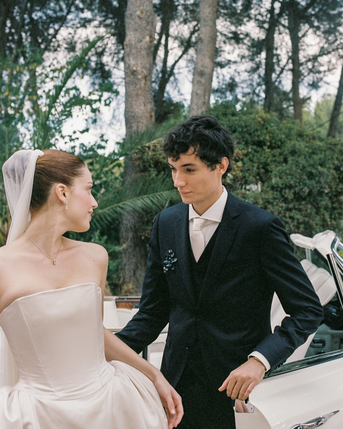 Dani opted for a more conventional cut. He wanted the suit to age well, and I completely agreed with him. He admitted that, a week before the wedding, he had considered wearing a suit from the brand Pellicer, which featured a cinched waist. Unfortunately, the sample that Gio Pellicer, the designer, sent didn’t fit, so he reverted to something more traditional: a black suit with a tailored vest, a tie made from the fabric of my first dress (the material was his only clue), and patent leather shoes.