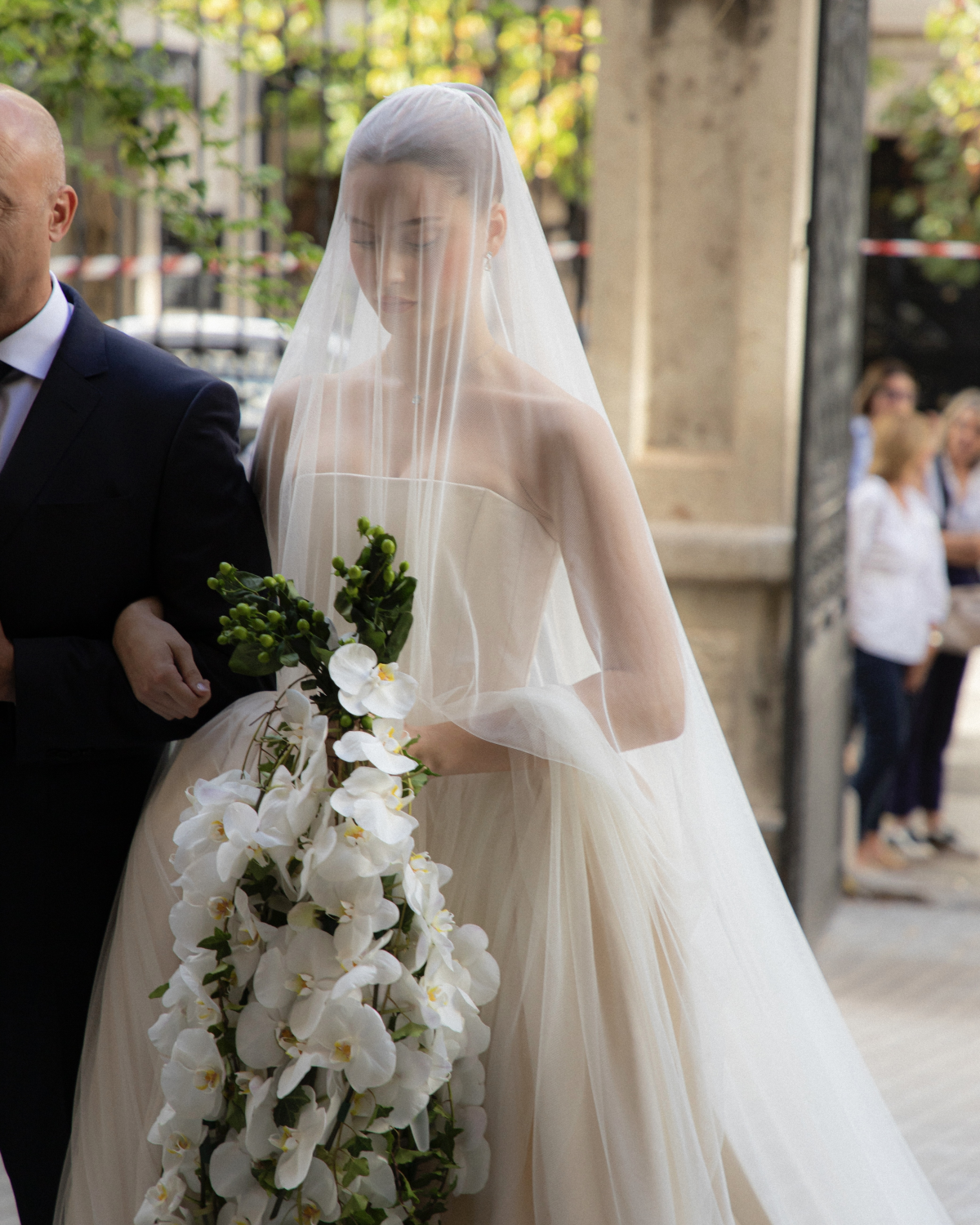 The moment that stands out most to us was the arrival at the basilica. Dani had been waiting and greeting guests for half an hour when suddenly he heard shouts of "The bride!" and "The bride is here!" I arrived exactly on time at 16:59, instead of the usual five to ten minutes late for a bride, which took everyone by surprise. Dani quickly turned around, and the only people he could see were our bridesmaids, who were crying as they watched me perfect my veil and dress for the entrance.