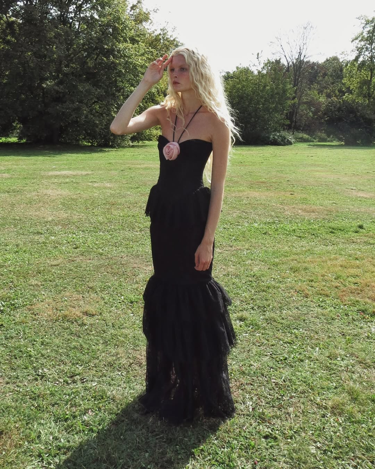 At Rasario, you'll find pieces with textured lace, voluminous rosettes, and playful shapes. The brand is synonymous with the glamour and drama of Old Hollywood elegance. Between the iconic corsetry, rich fabrics, and striking silhouettes, this brand is designed to turn heads while maintaining a sense of sophistication.