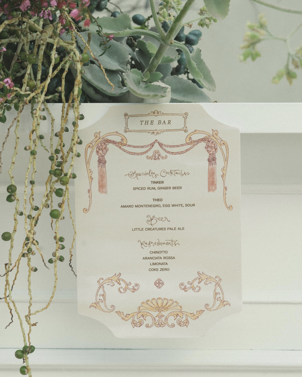 We collaborated with byV to design all our stationery, and it turned out to be everything we had dreamed of. To give our guests a memorable keepsake, we incorporated elements from our invitation into a beautiful scarf. Every detail on that scarf held significant meaning for us, serving as a personal ode to our wedding day. Even though my favorite flowers, hydrangeas, were out of season in Australia, Laice and Hattie made sure I had them in my favorite colors, which truly meant the world to me.