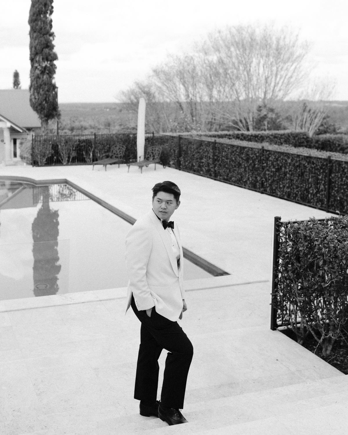 He wore three looks to complement me throughout the day. For the ceremony, he chose a morning dress that matched my English wedding gown, featuring traditional colors and shapes for a classic look. He paired this with custom Edward Green Carnegie shoes, finished in black cordovan leather for a polished appearance without patent leather. Next, he transitioned into a white tuxedo made from heavier wool to prevent creasing, paired with contrasting fresco wool pants and traditional John Lobb shoes. Finally, for the after-party, he opted for a sharp full fresco wool tuxedo, complemented by elegant velvet slippers from Rubinacci. All suits were tailored by Trunk Tailors, with bow ties for the second and third looks from La Noued Papillon.