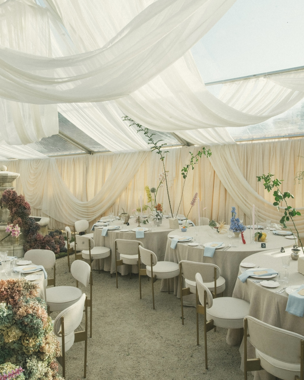 Laice did an amazing job positioning the marquee at the front of the venue. Half of it was open, allowing us to appreciate the stunning chateau as our backdrop, while the other half was elegantly draped, creating a warm and romantic atmosphere. Hattie styled each table with exquisite flowers and centerpieces, ensuring that every detail felt thoughtfully curated and unique. When we entered the reception in our second look, it was a surreal experience to see our guests seated in the candlelit area. As dinner began, we were treated to heartfelt speeches from our lovely sisters, which truly warmed our hearts. To top it all off, my childhood friends sang us a beautiful performance, making it an unforgettable moment we will always remember.