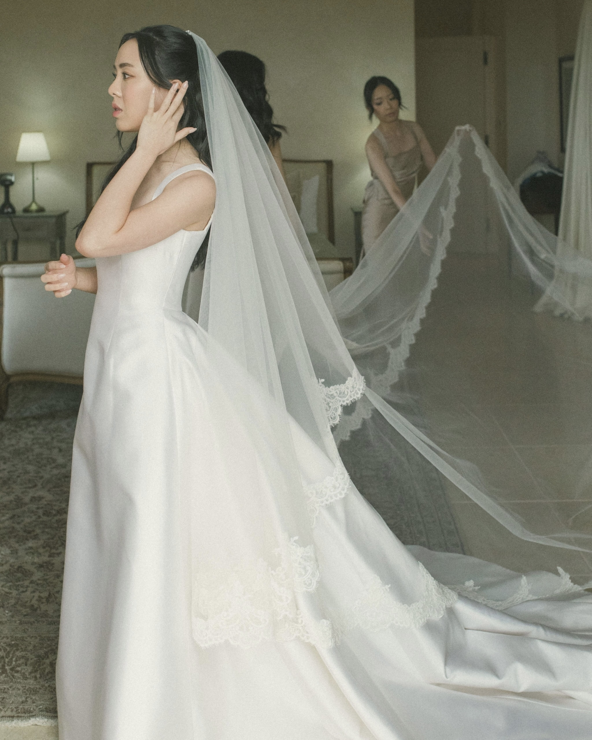 I wore three beautiful looks on my wedding day. My first was a bespoke gown by Emilia Wickstead, designed with the vision of achieving something classic yet modern, exuding regal grace. It featured her signature architectural silhouette and a perfectly square neckline with rectangular pleats crafted from a stunning shade of ivory silk mikado. For the evening, I changed into a bespoke silky white gown by Lillian Khallouf, a vision of simplicity with a bold neckline and a modern, sophisticated cape that captured the essence of the night. I also changed my hair to complement the gown. Finally, I concluded the night in a playful mini gown, perfect for celebrating and dancing the night away.