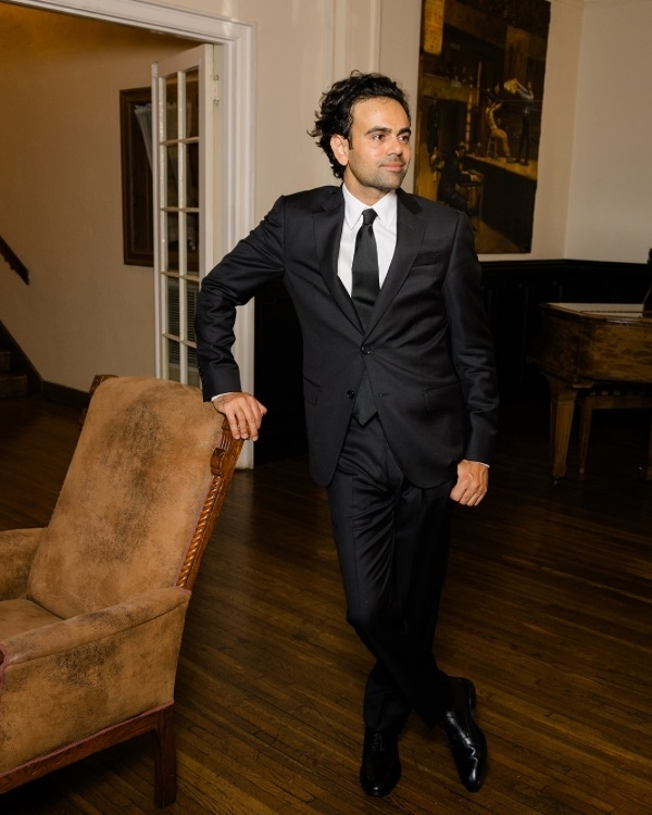 A classic black Armani suit. I love how it looked next to my unique wedding gown.