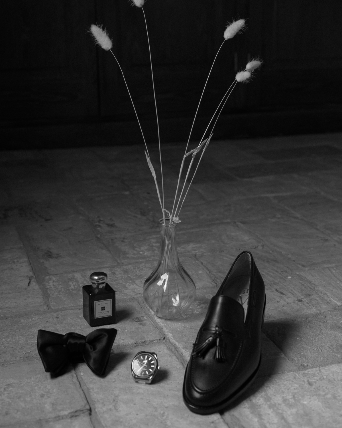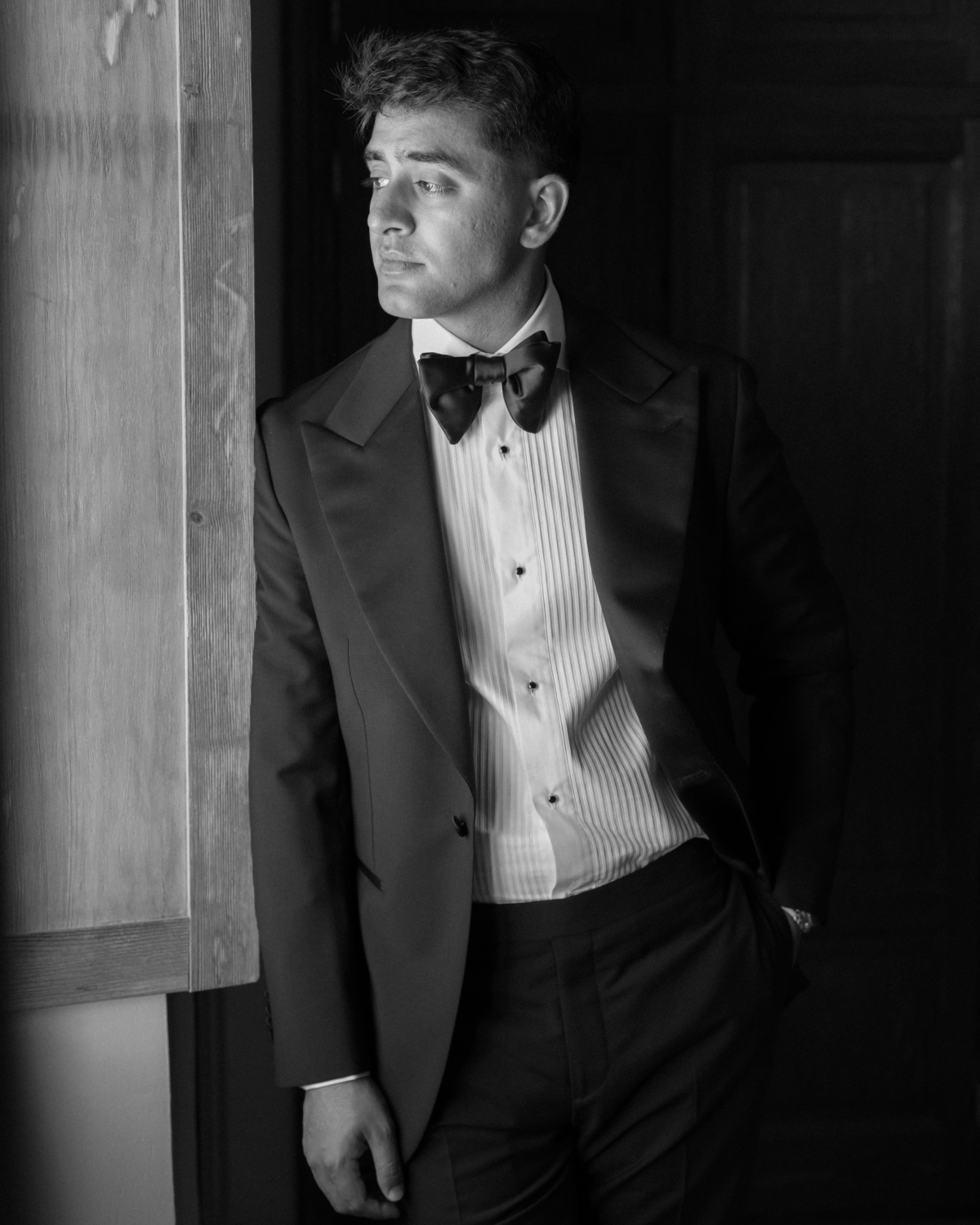 On the wedding day, Riz wore a custom tuxedo from Suit Supply. He had considered a linen tux but opted against it since linen wrinkles easily. Instead, his tux was crafted from a linen-wool blend with a wide lapel. The inside of the jacket featured a burgundy silk lining with embroidery that read "Sim and Riz," along with our wedding date. He paired the tux with a large silk Tom Ford bowtie and black leather loafers from Arzignano, Italy.