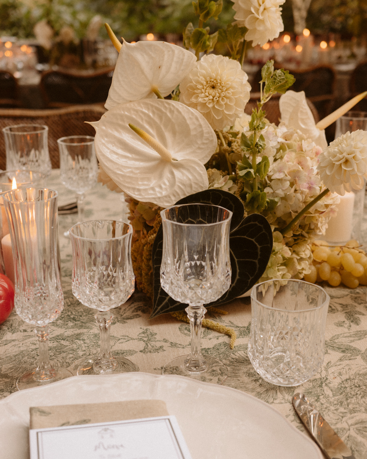 After the ceremony, our guests made their way to the pool area for Aperitivo hour. We served eight different canapés, and for drinks, Reezaan’s signature cocktail was a dirty martini, while mine was a jalapeño guava margarita. Afterward, guests were escorted upstairs to the courtyard, where we had one long dinner table set for all 120 guests. The setup was absolutely breathtaking, with drip lights hanging over the tablescape and Toile de Jouy linens draped across the table. We had candles, heirloom tomatoes, grapes, peppers, anthuriums, and amaranthus beautifully arranged.