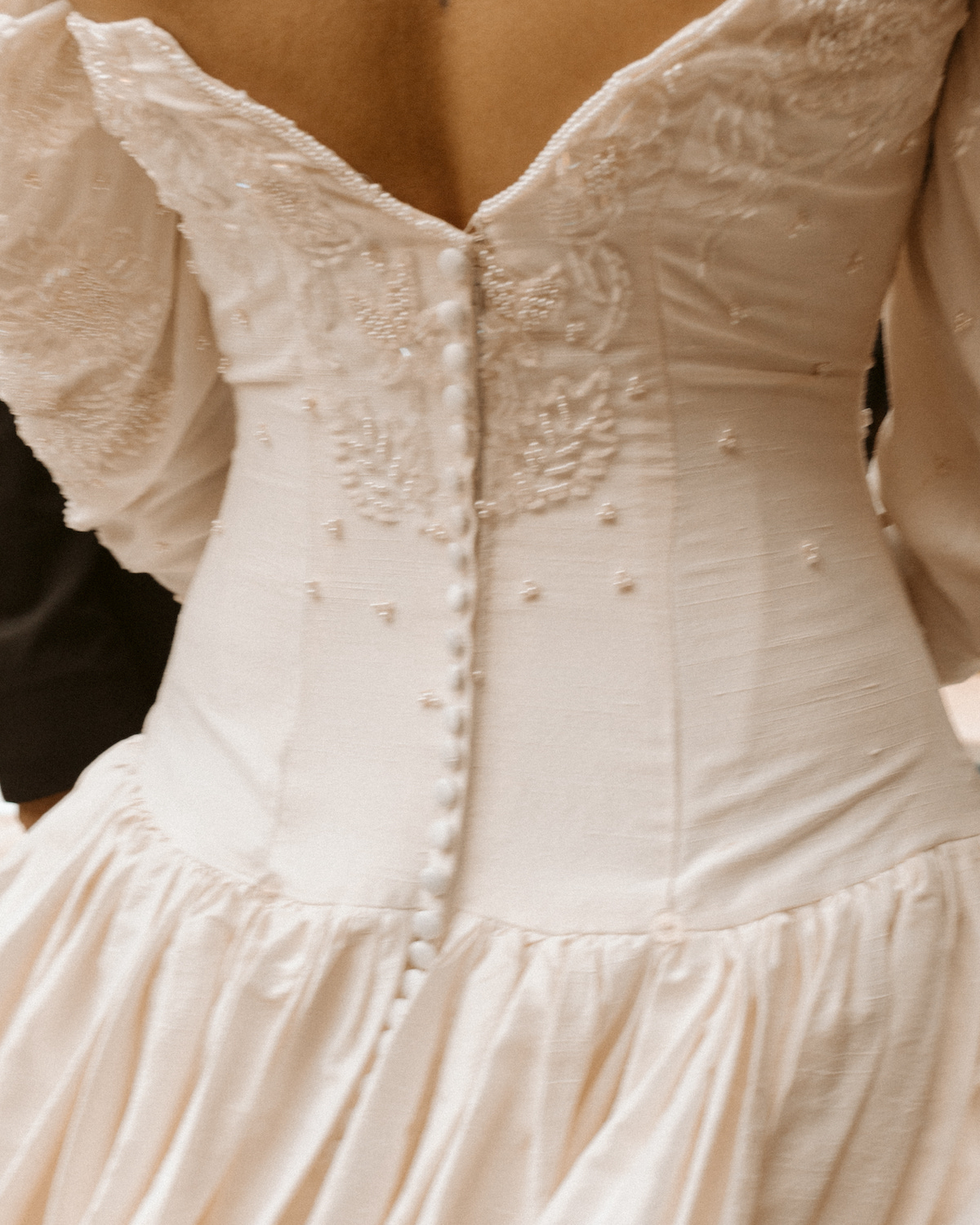 For my wedding dress, I always knew I wanted a drop waist. I searched high and low, from vintage to Vivienne Westwood and Danielle Frankel. I tried on many beautiful dresses, but nothing was resonating with me. Then, I went into a bridal boutique in Atlanta, not really expecting much. But a small vintage rack tucked in the corner caught my eye. I found a stunning vintage 80s Oscar de la Renta ivory drop-waist dress, and I honestly tried it on as a joke—mainly because it reminded me of the dresses Rachel and Monica wore in that one episode of Friends. But when I slipped it on, I instantly fell in love, and that’s the one I went home with! It stayed in alterations for about five months: the neckline was lowered, the waist was taken in and structured, and the long sleeves were made detachable. It was important to me to preserve the original silhouette and beadwork of the dress, and I think my seamstress did a wonderful job maintaining that.