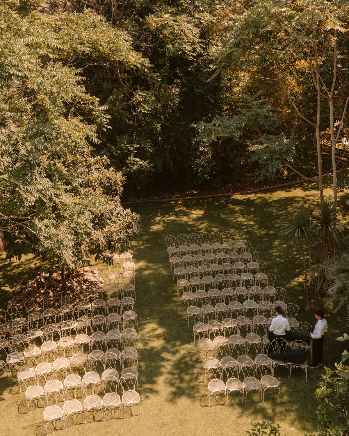 Upon arrival, our guests were welcomed with a glass of champagne in the courtyard. As they made their way down to the garden to take their seats for the ceremony, they were greeted by two live violinists. For seating, we chose ivory wrought iron chairs, arranged in an open U-shape across the lawn.