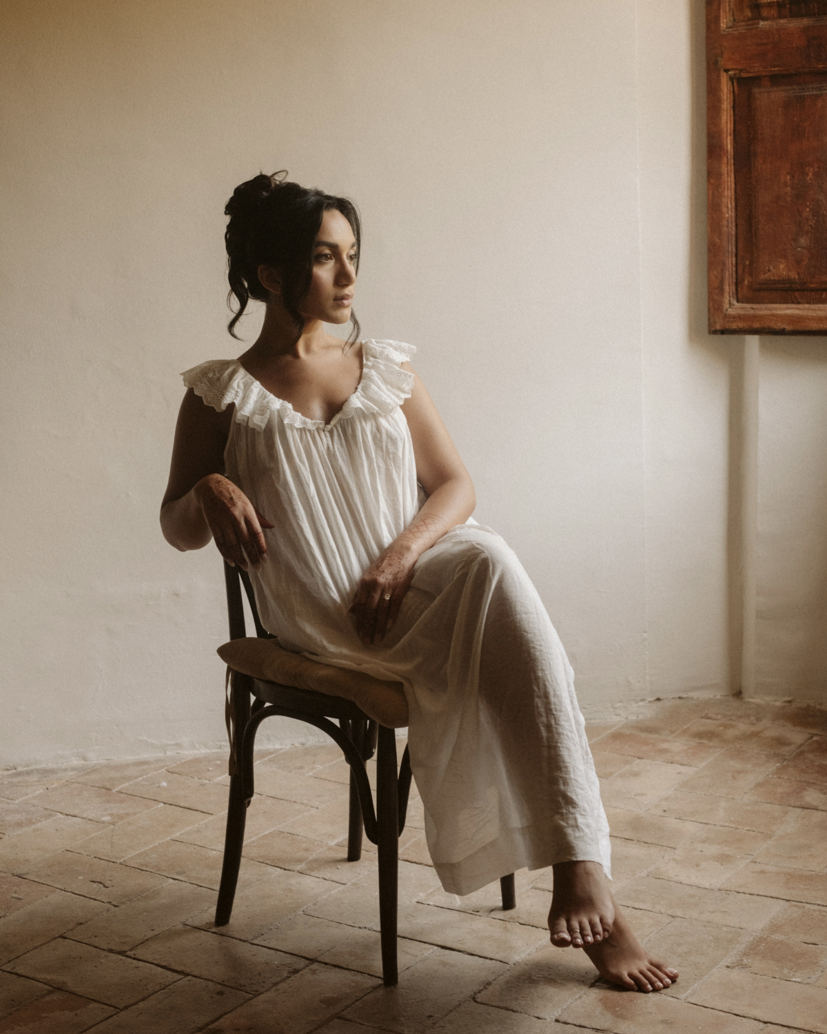 For the Sangeet dinner, I changed into an ivory embroidered sharara set by Seema Gujral. This was actually the first outfit I found for our wedding when I was in New York, at Ave India Design. I didn’t know exactly when I’d wear it, but I knew I had to have it. The silhouette felt very early 2000s Bollywood, which I absolutely loved. The morning of the wedding, I got ready in a cotton white floral crochet maxi nightgown from Dôen. It was honestly the best decision ever—it was so comfortable.