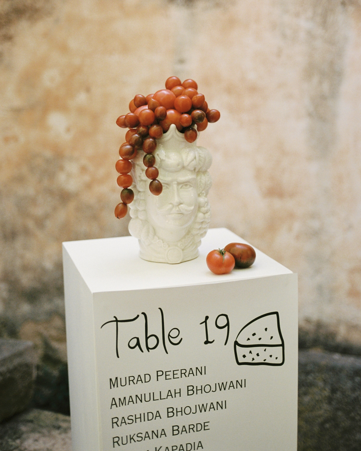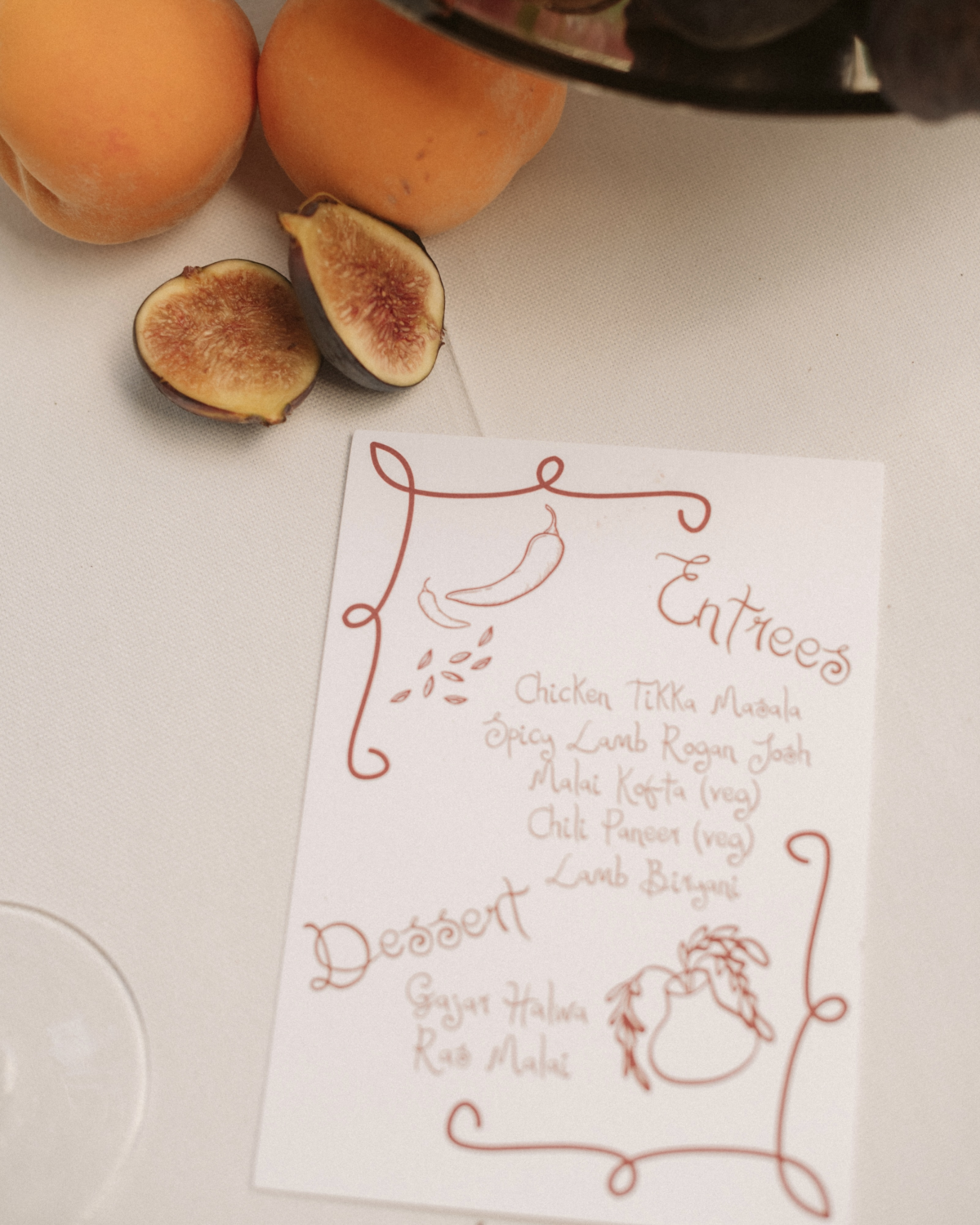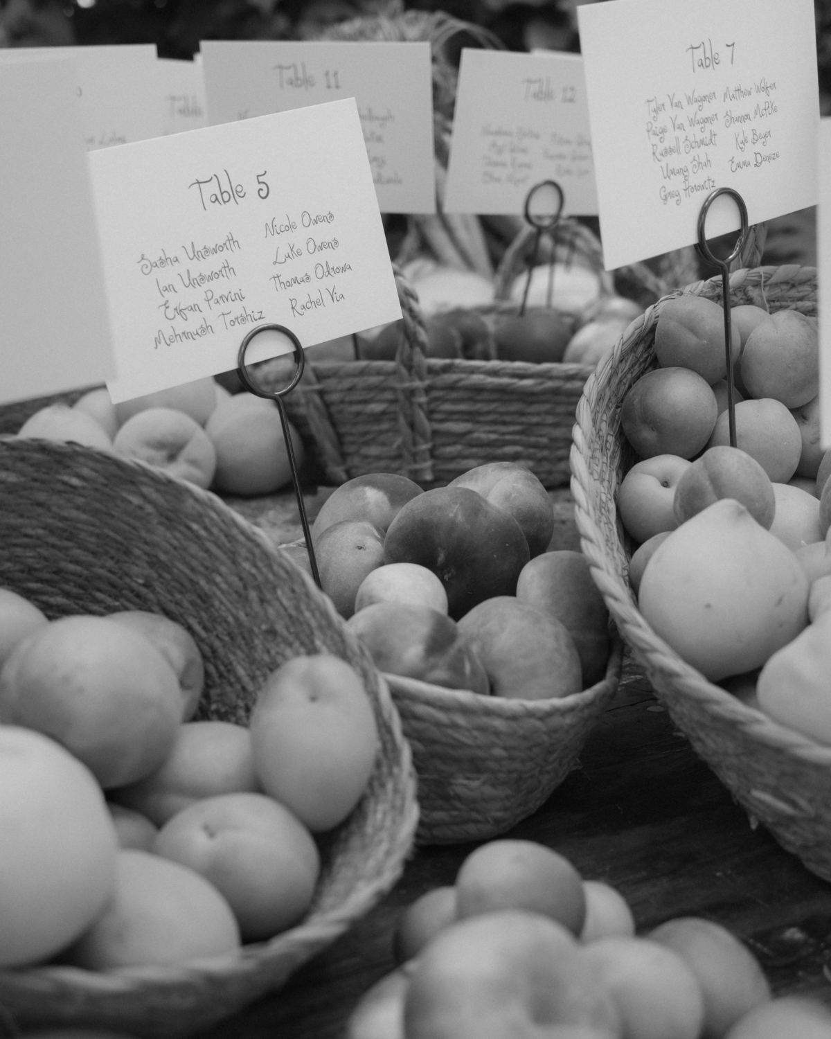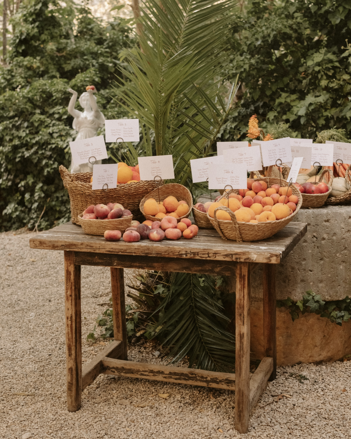 Our planners had already prepared some items for the gift bags in advance, but upon arriving in Sitges, they visited the local markets to find a few special, locally inspired touches. After the welcome dinner, our guests were given burlap bags with a wedding itinerary, a personal message, a custom matchbook, black truffle Torres chips, cobalt blue water bottles, fresh fruit, a bamboo fan, and Advil—because, well, we had a crazy few days ahead! For our Sangeet dinner, I envisioned a seating assignment display inspired by an Indian bazaar. Our florist created a stunning display, filling a table with baskets of various local produce. Each basket held custom stationery by Mudari, featuring the table number and guest names.