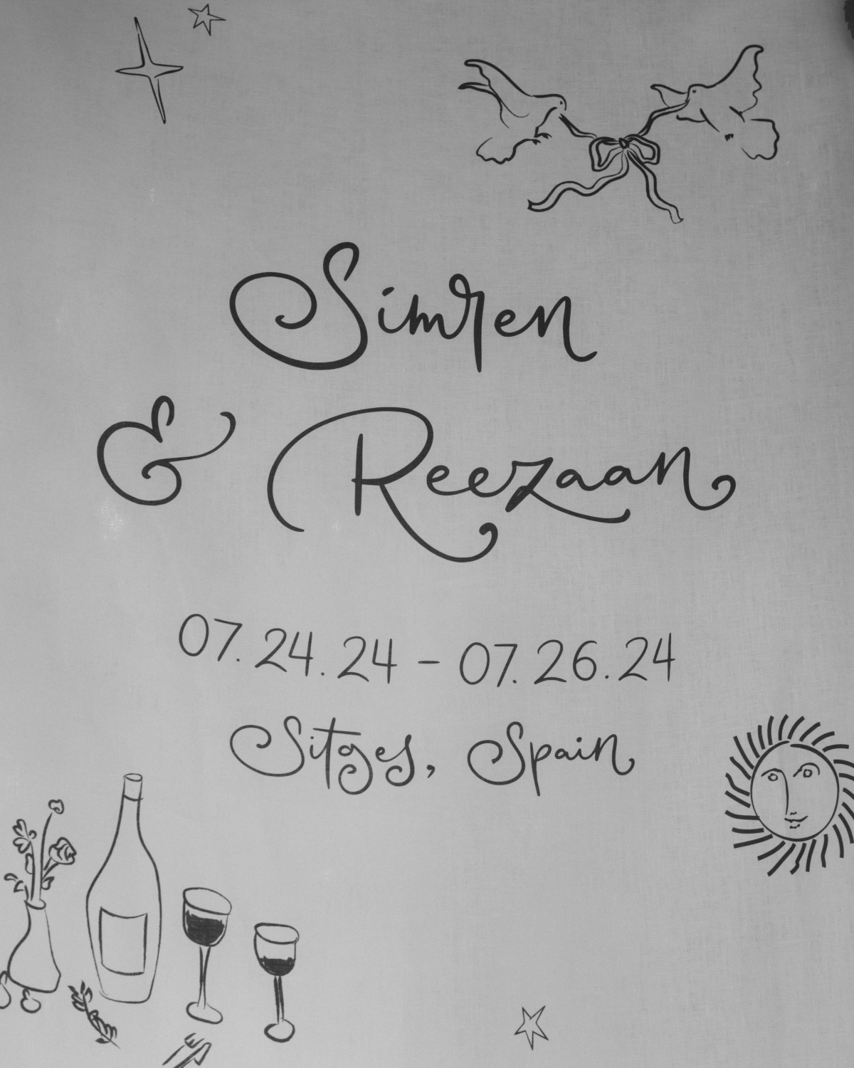 For the welcome sign, I wanted to take a different approach than the typical framed option. Our planner, Kat, found a company based in Australia that creates custom linen signs. We had a large linen drape hanging from a tree to the floor in the villa's courtyard, with our names, the location, and the wedding dates, along with various small drawings that represented different aspects of the weekend. When we arrived in Sitges, Reezaan decided he wanted to surprise everyone with a speech on the last night. On the morning of the wedding, Riz jumped into the pool to have a moment to himself and rehearse.