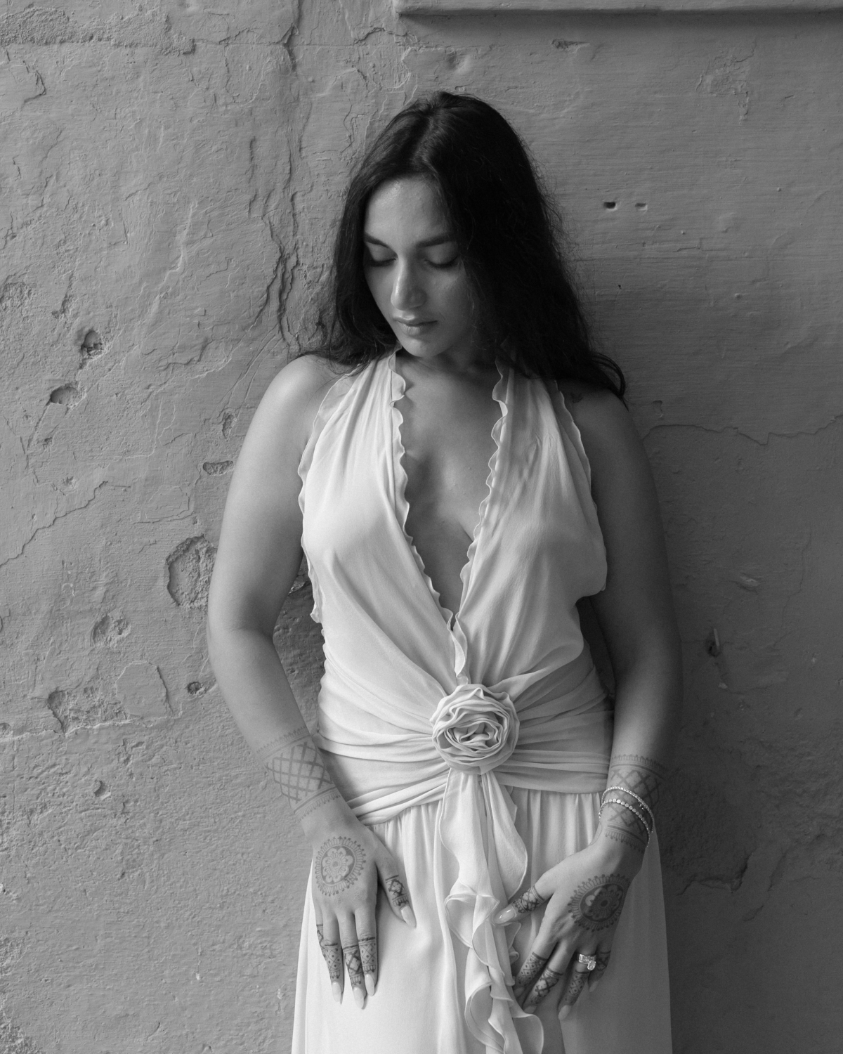With a 3-day, 4-event, Indian-American wedding, I had the chance to play with a variety of looks. For our welcome dinner at Pic Nic, a Mediterranean restaurant on the beach, I wore a floor-length blush Blumarine dress, which turned out to be one of my favorite looks. I kept my natural, wavy hair down to complement the dress's deep open back, and I felt so laid-back yet special throughout the evening. The next morning was our Pithi (turmeric ceremony), for which I had two looks. The first was a simple custom creation by Panache: a two-piece ivory Chanderi silk set. I loved the thin straps of the kurta and the flared, pleated palazzo pants—perfect for the heat. For accessories, I wore a tennis necklace gifted by my in-laws and vintage Giorgio Armani round tortoise-shell sunglasses, inspired by John Lennon.