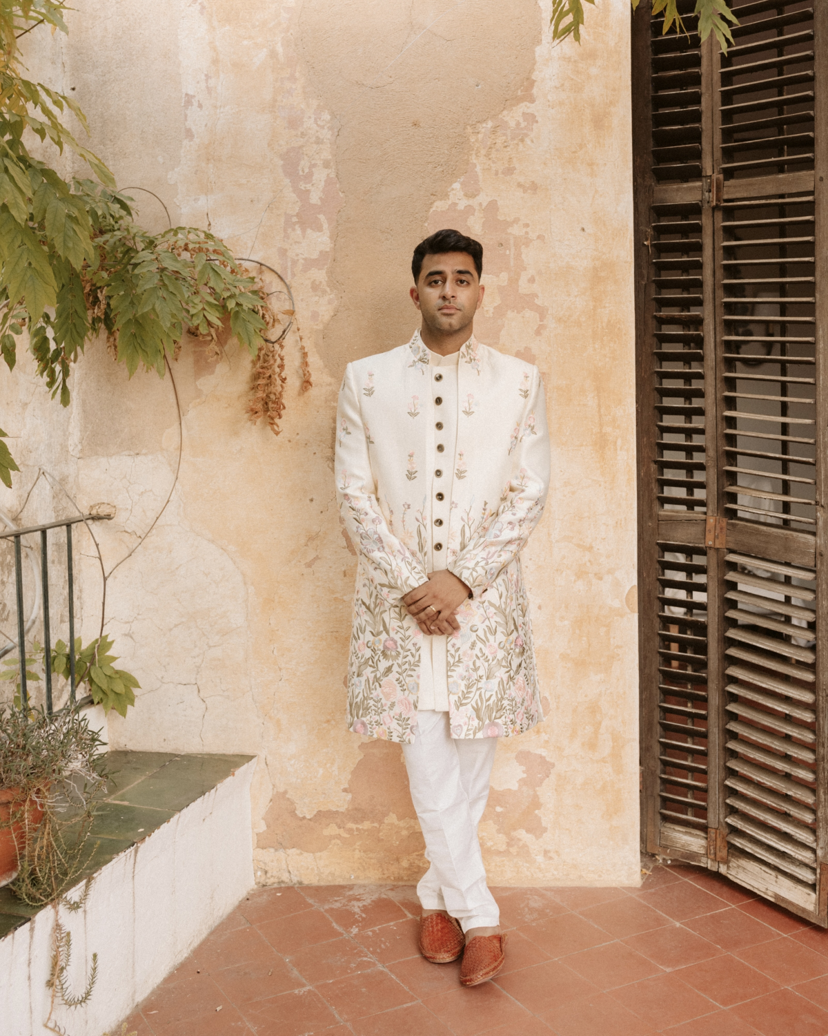 For the Pithi (turmeric ceremony), Riz wore a satin mustard kurta set with a matching vest. For lunch, he changed into a pink silk Casablanca button-down shirt paired with white linen pants. The pattern on his shirt was insane. This was honestly one of my favorite looks of his. For the Sangeet, Reezaan wore a custom kurta set with a floral-embroidered jacket from India. The muted pastel florals on the jacket beautifully complemented both our venue and my lehenga. Later, for dinner, Riz changed into a relaxed white mirror-work kurta set, also made in India.