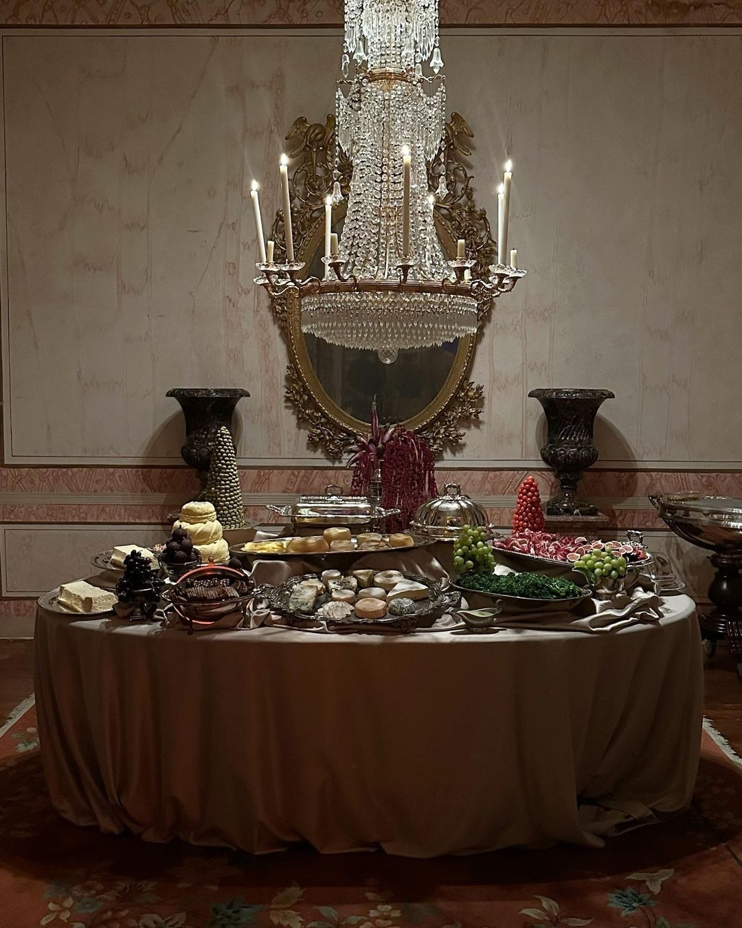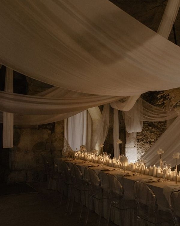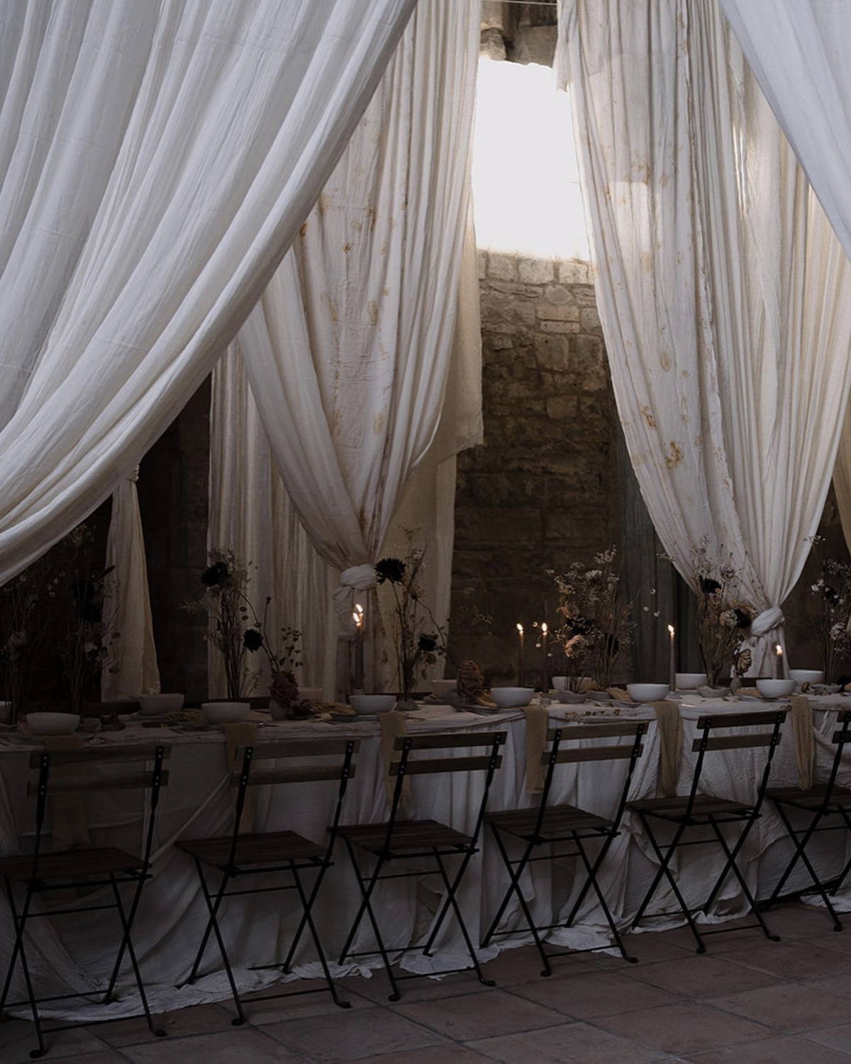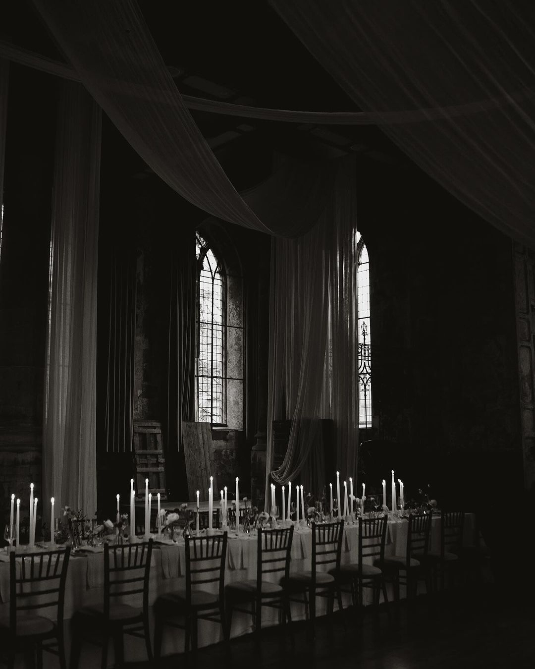 Enter a world where classical European elegance meets timeless artistry in wedding event design. Inspired by the poetic richness of classical still life oil paintings and reminiscent of a medieval banquet, every detail is steeped in opulence and an undeniable moody ambiance. Spilling with draped ivory taffetas, alluring antique silverware, scattered dark grapes and stone fruit, aged blooms and ornate goblets under flickering candelight, all set against a backdrop of European inspired architecture. Evoking a sense of refined beauty that transcends time and eras, a beautiful approach to any wedding tablescape.