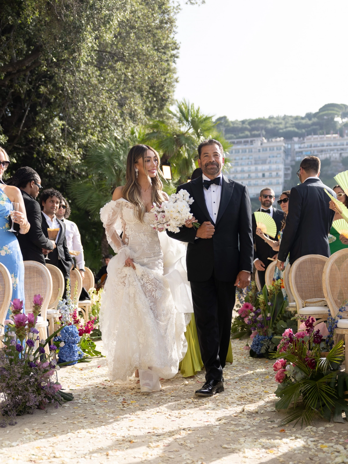 For this beautiful wedding, a team of planners and florists envisioned a floral arrangement that boasted vivid colors while maintaining classic shapes for the bouquets and arches. The striking combination of burgundy chrysanthemums and gerberas, complemented by tropical pink orchids and turmeric accents, and highlighted by refreshing sea-colored hydrangeas created an unforgettable fusion of fiery tropics and cool seaside vibes. All of these elements were set against a backdrop of lush greenery and delicate palm leaves, resulting in a breathtaking composition.