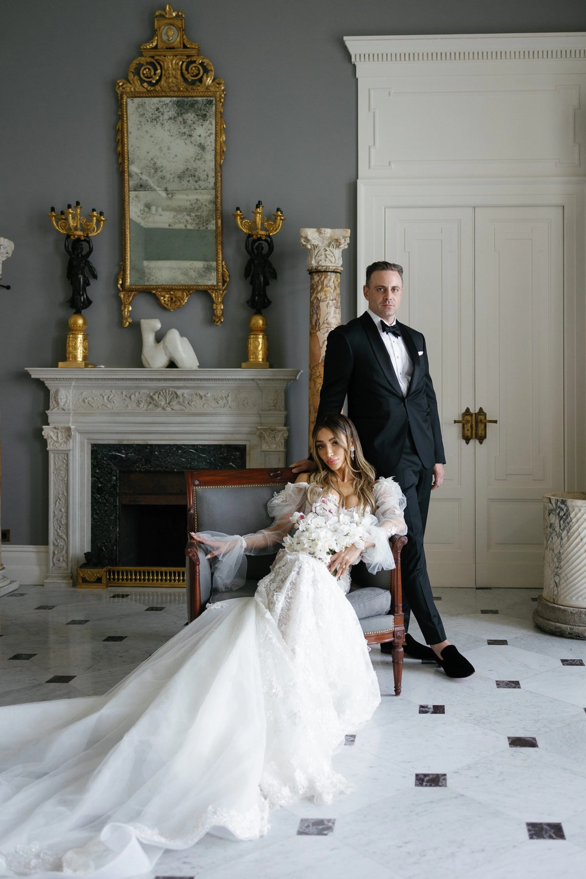 To enhance the stunning image of the bride in her Galia Lahav Dress, the classic bouquet featured a cascading arrangement of white mini-orchids with touches of fiery red accents, perfectly aligning with the arch's color scheme. Sam, the groom, exuded elegance and luxury akin to a modern-day James Bond.