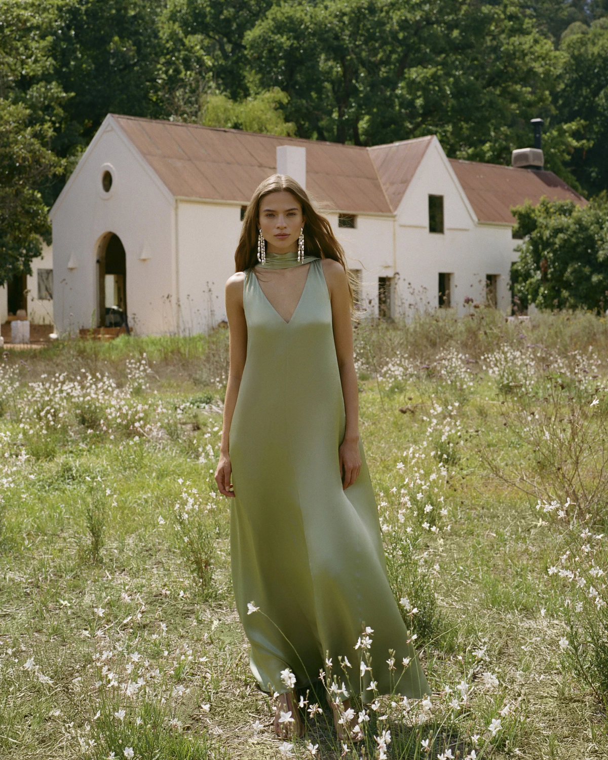 Rendered across some of Shona Joy’s most recognizable bridesmaid silhouettes, including the La Lune Scarf Panelled Maxi Dress and La Lune Ruched Halter Maxi Dress, "Fern" introduces a fresh new energy. Fluid draping, soft ruching, and elongated lines allow the shade to take on new dimension, revealing its depth through movement and light. "Fern" reveals an alignment between self, place, and form, shaping a vision of bridal dressing that feels current yet timeless.