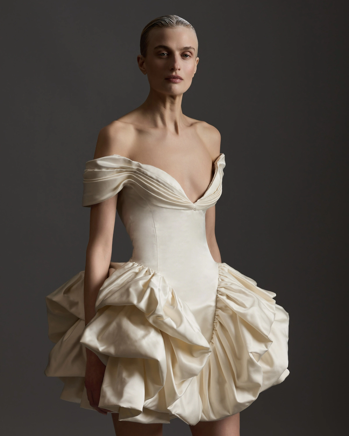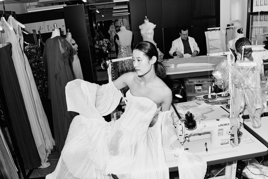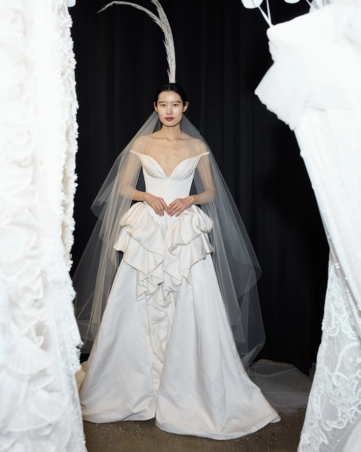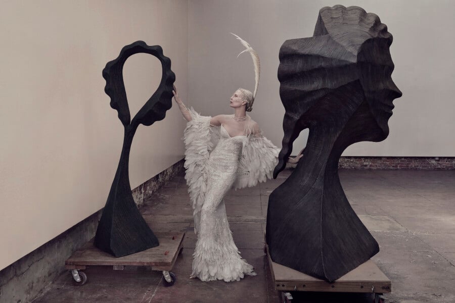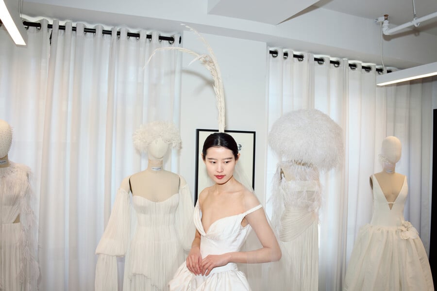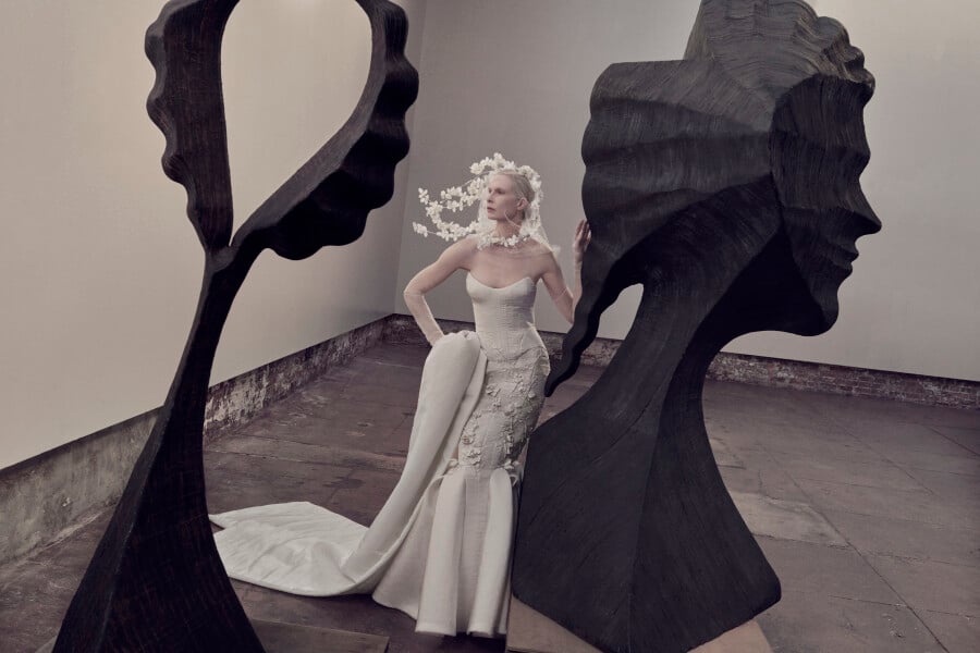 Texture plays an equally compelling role throughout the collection. Elsewhere, a hand-cut organza feather bustier – requiring over 200 hours of craftsmanship – introduces a tactile lightness that feels both directional and romantic. It is the sort of piece that transforms a look entirely, balancing technique with ease. That same sensibility runs through the wider collection, where surfaces are layered, pleated, feathered, and folded with an expert hand. What makes this season particularly resonant is its versatility. These are looks designed for those curating a mood rather than following a formula. Clean-lined gowns sit alongside statement separates, while volume is handled with restraint. Nothing feels excessive, everything feels considered. Accessories bring a playful final note. Jeweled mini veils and whimsical headpieces punctuate the collection with personality, offering a welcome departure from expected bridal styling. They feel less ceremonial, more fashion-led – pieces chosen to express character rather than convention. Enjoy atelier photographs captured by Calenrose alongside the brand’s official launch imagery.