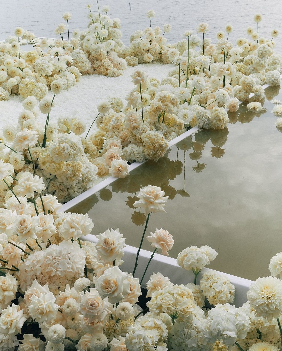 While technically not an altar arrangement, a curved flower-lined aisle offers a unique twist on tradition. Flowers bloom from the ground, winding in an organic manner like a natural path carved out amongst a meadow, leading the bride to the altar, her destiny. For maximum impact, the curved aisles are best created as a wide line of tonal florals framing either side of the altar, and best complete with an arch or sculpture at the end to anchor the space.