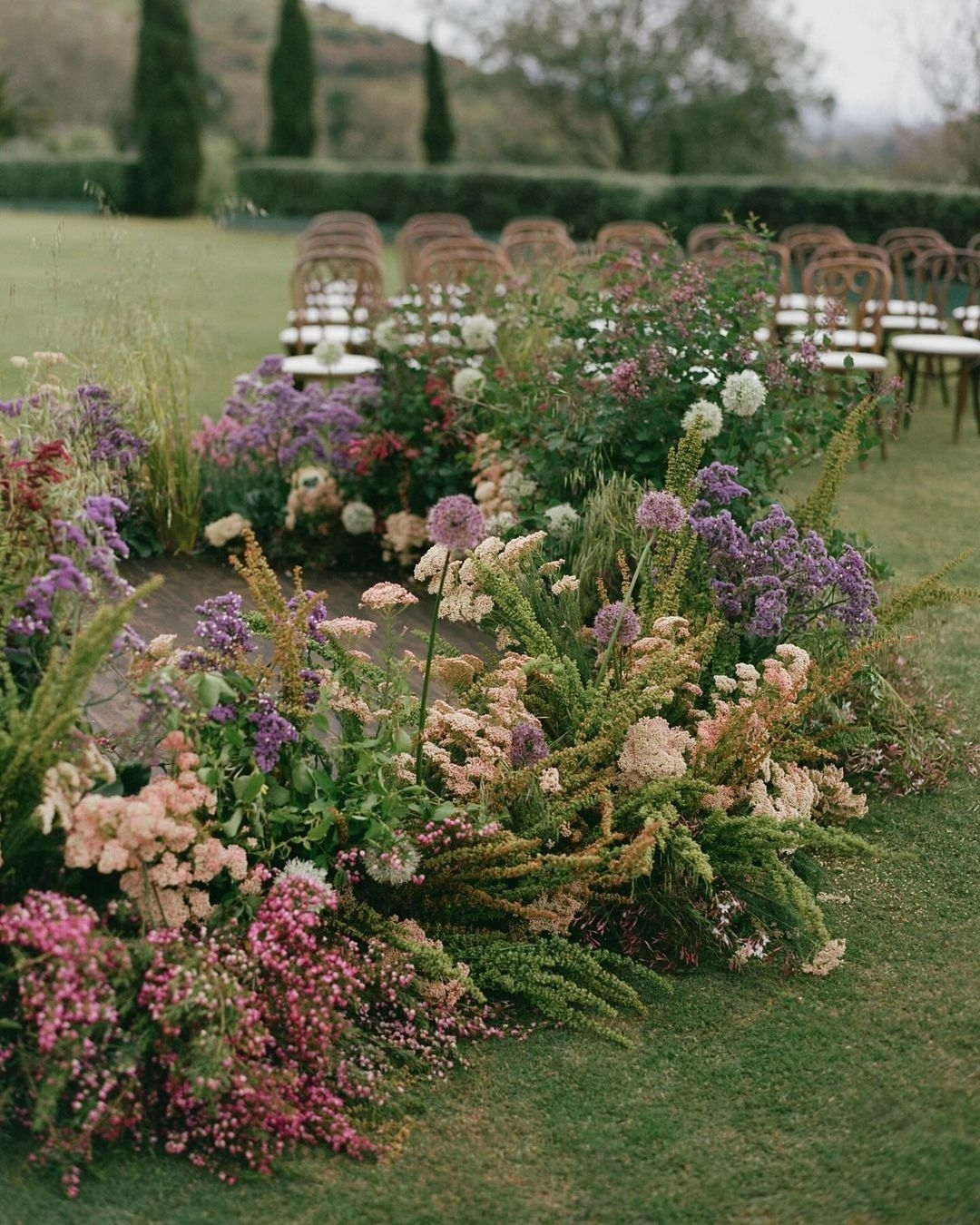 Wildflower arrangements on pedestals or scattered along the altar provide a whimsical, carefree atmosphere that feels fresh and organic. This style works beautifully for outdoor weddings in gardens, meadows, or other natural settings, where the wildflowers blend seamlessly with the surroundings, creating an effortlessly romantic backdrop for the ceremony.