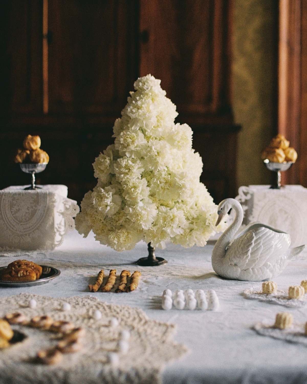 Swancore is officially in session. These birds are everywhere—etched into desserts, perched in centerpieces, and inspiring a tablescape rooted in nostalgia. The mood is delicate yet dramatic, with antique china, pale palettes, and a whisper of old-world romance. Timeless, tender, and undeniably chic. What else could you ask for on Galentine’s night?