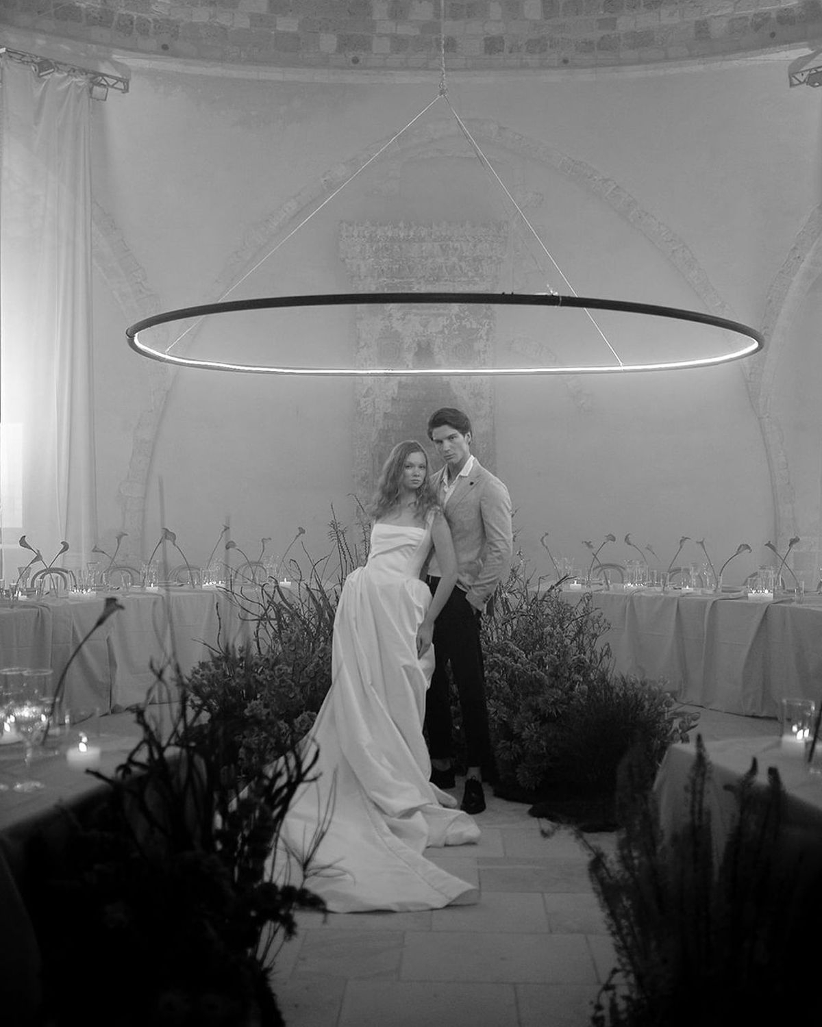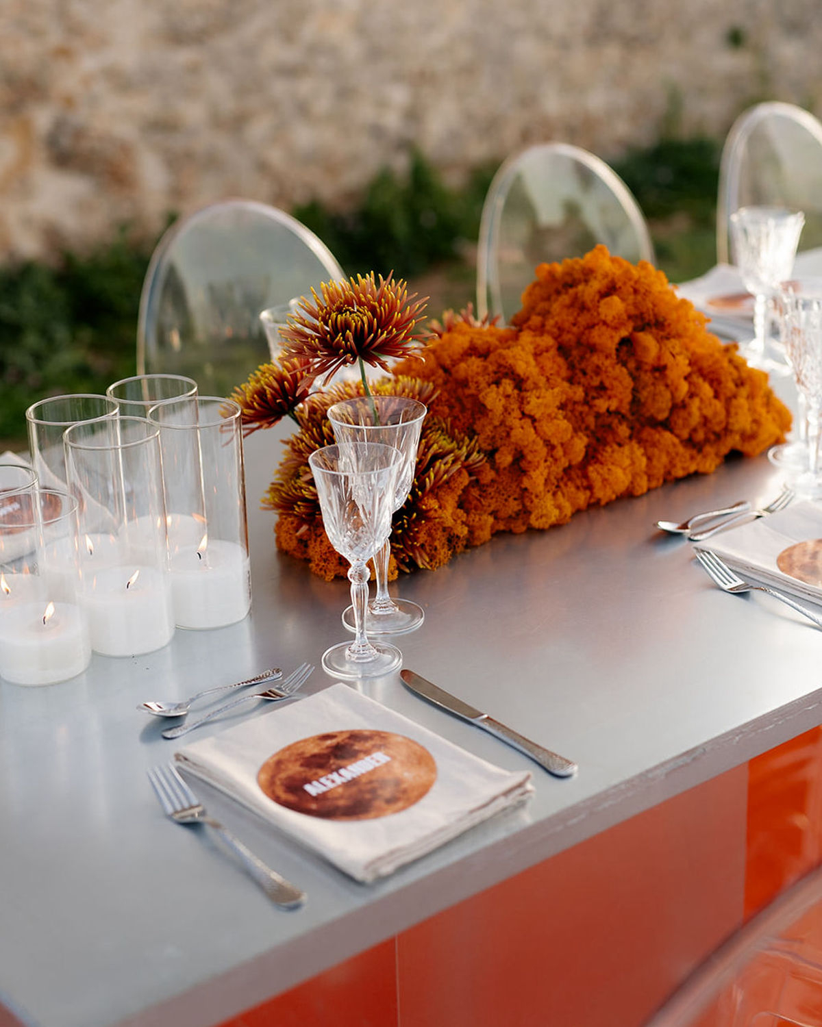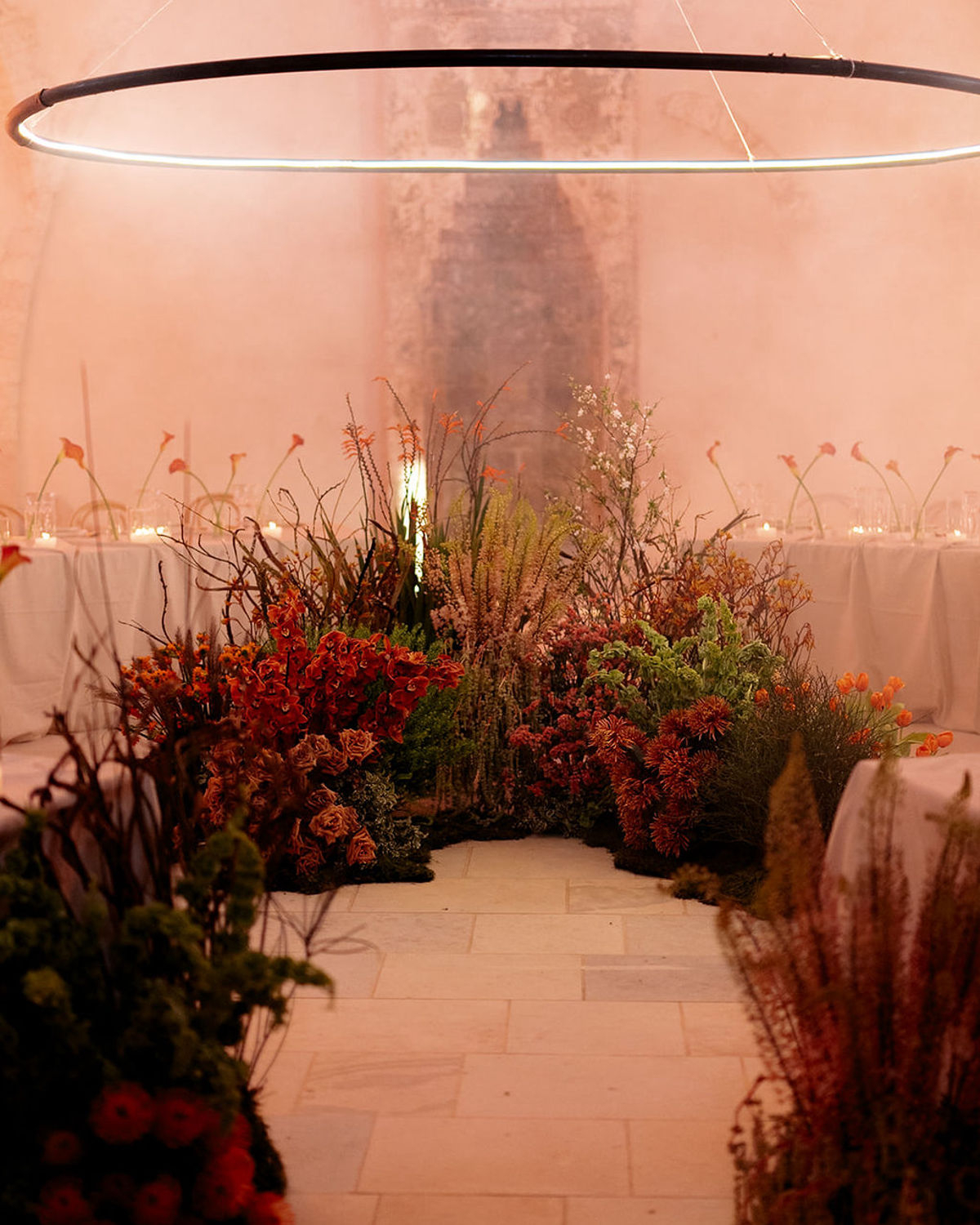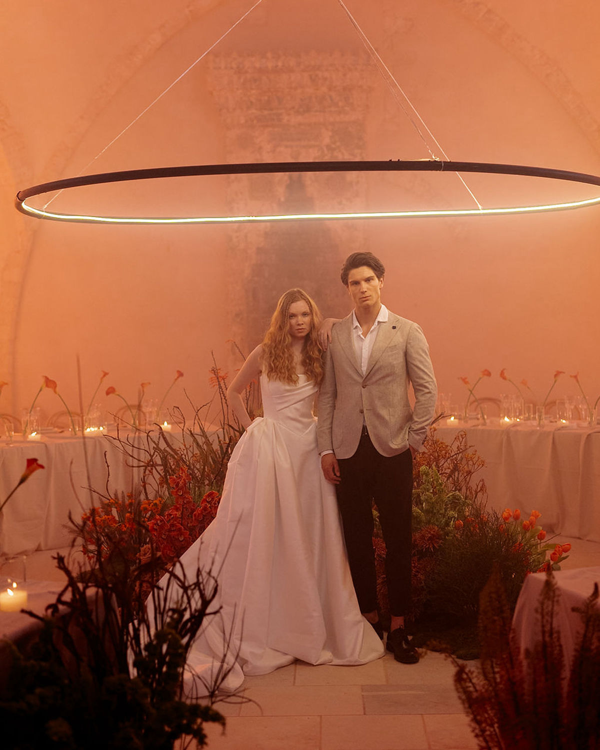 At the heart of it all is a couple, whose quiet intimacy is framed by a beautiful honey-ochre limestone that pairs perfectly with orange tones of floral comopsitions. Light becomes its own language here. A sculptural LED ring encircles the couple in a modern halo, and a projected orange moon casts a tender glow—part celestial, part cinematic. These bespoke installations do more than illuminate the space, they hold the emotion in place, casting romance as something sacred and enduring.