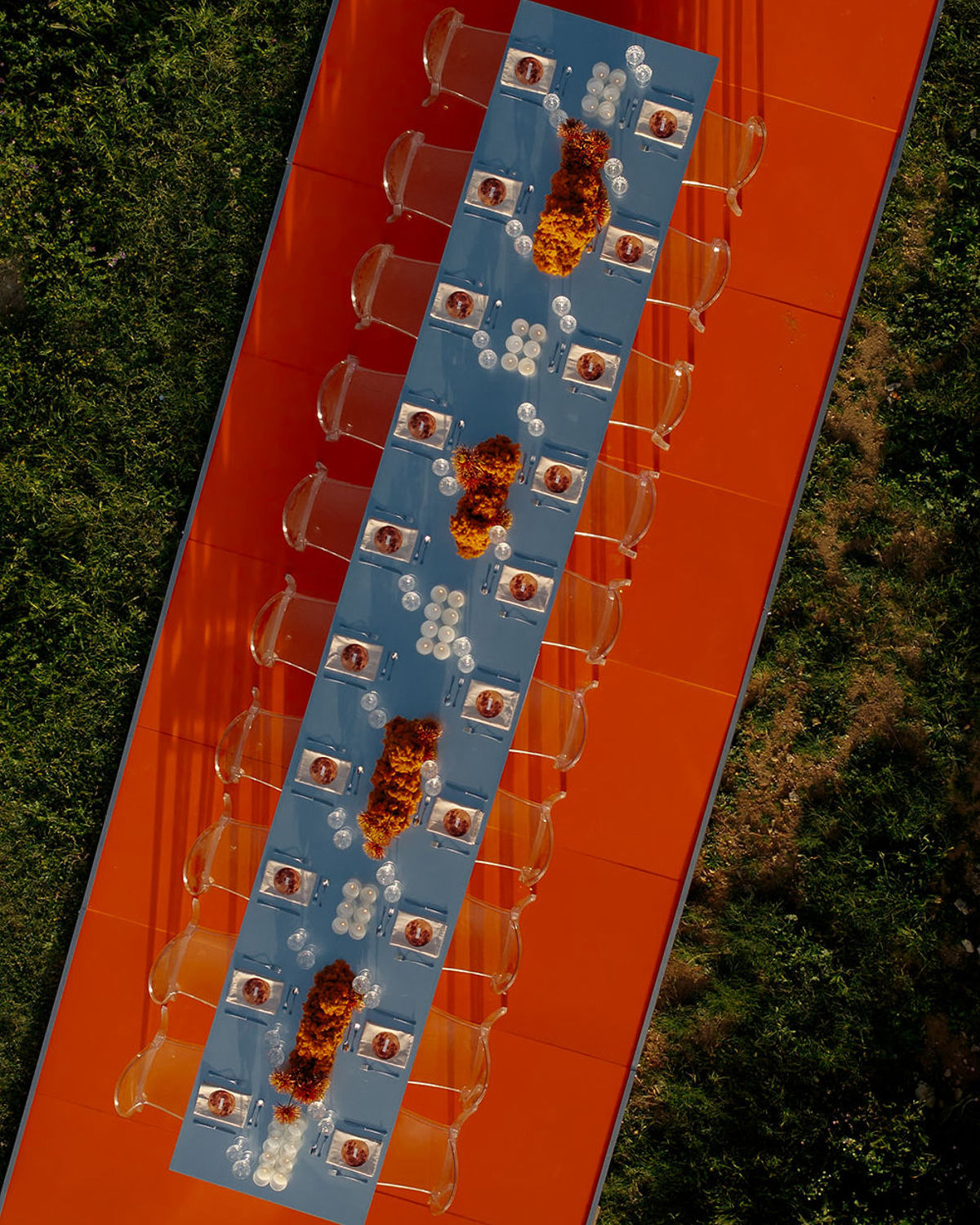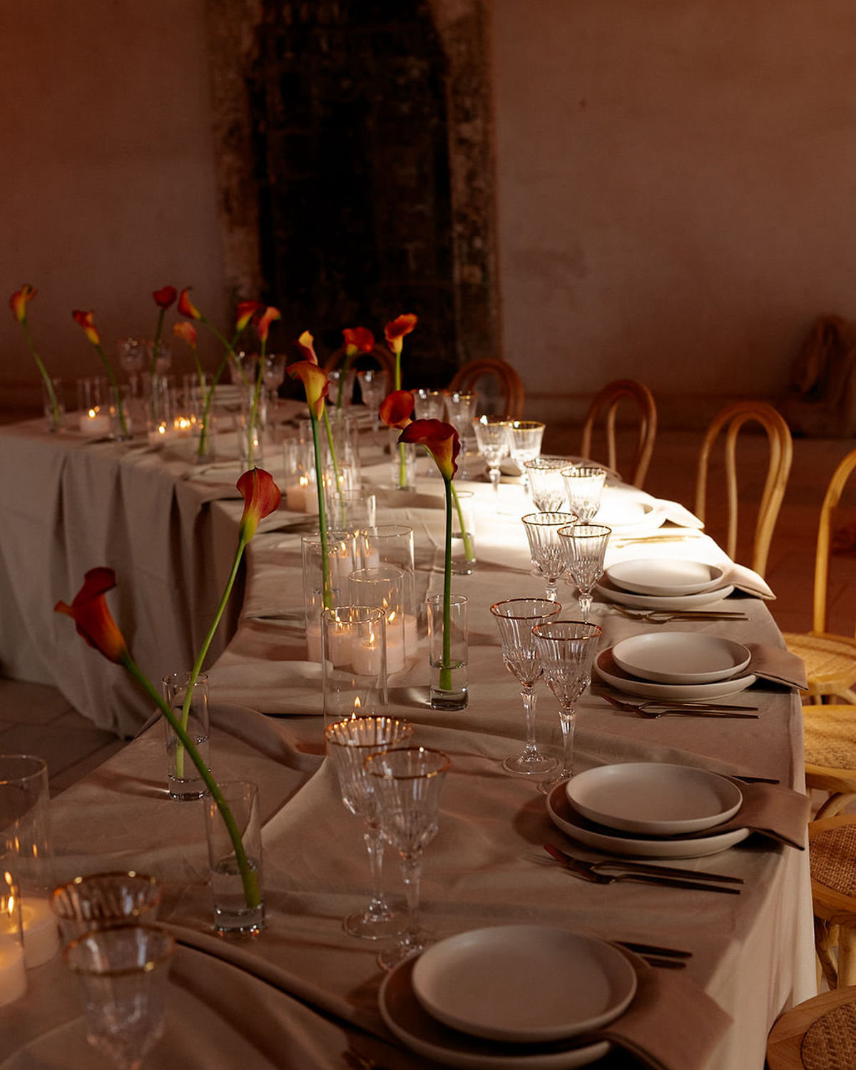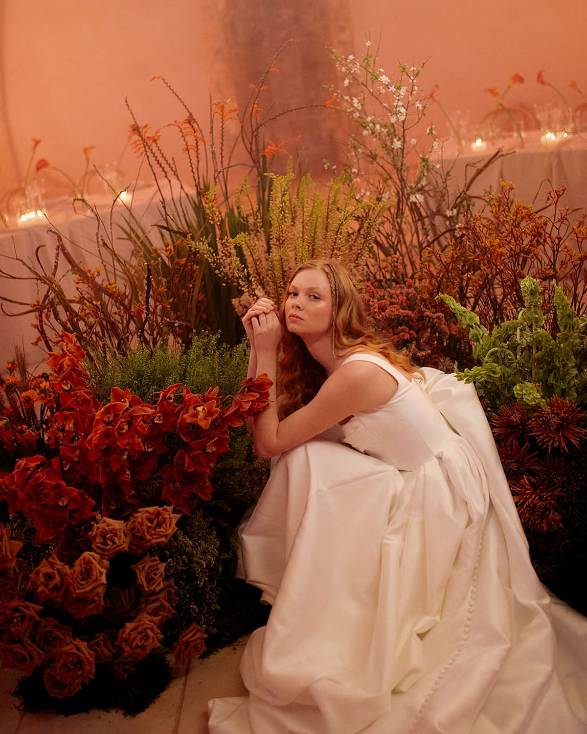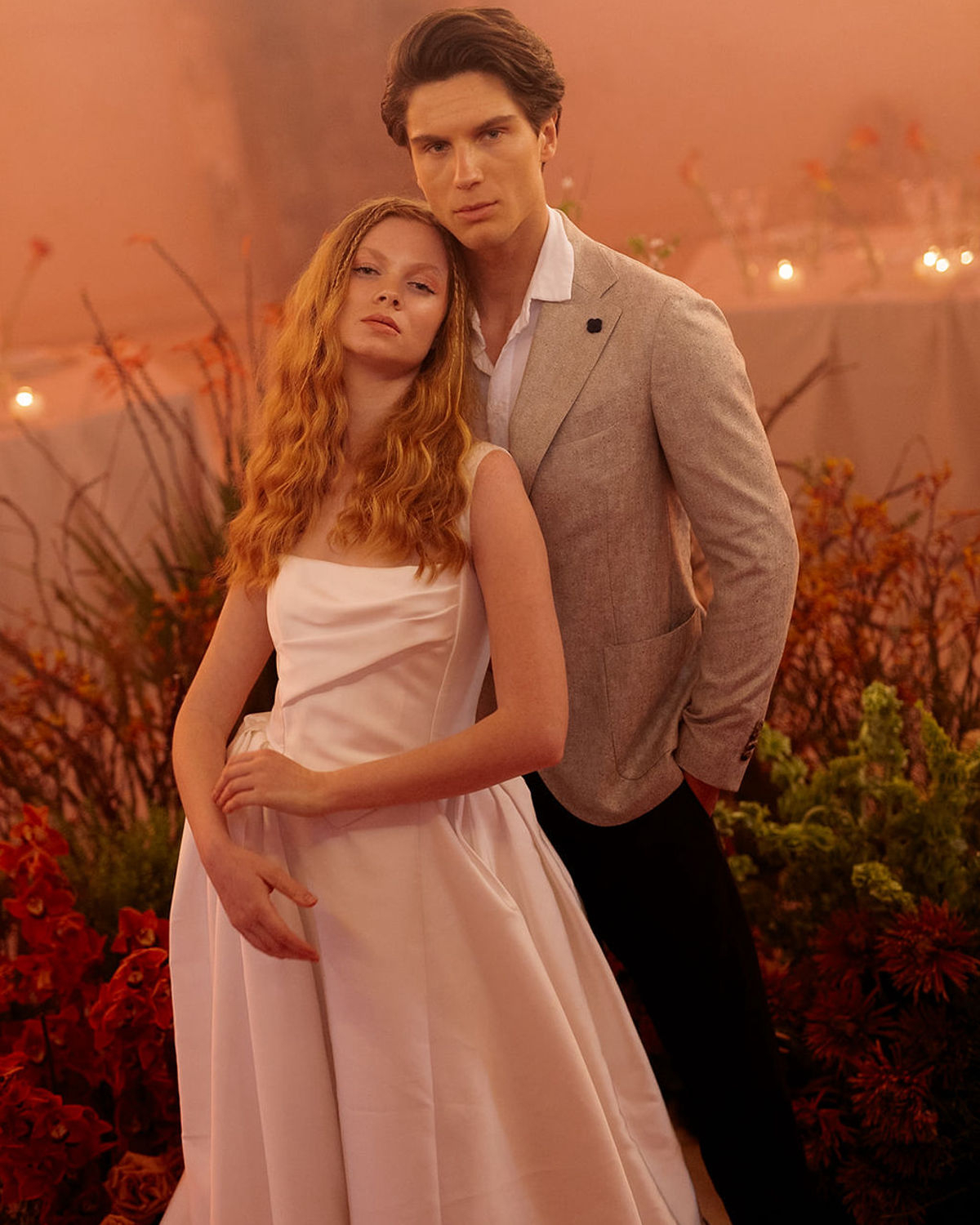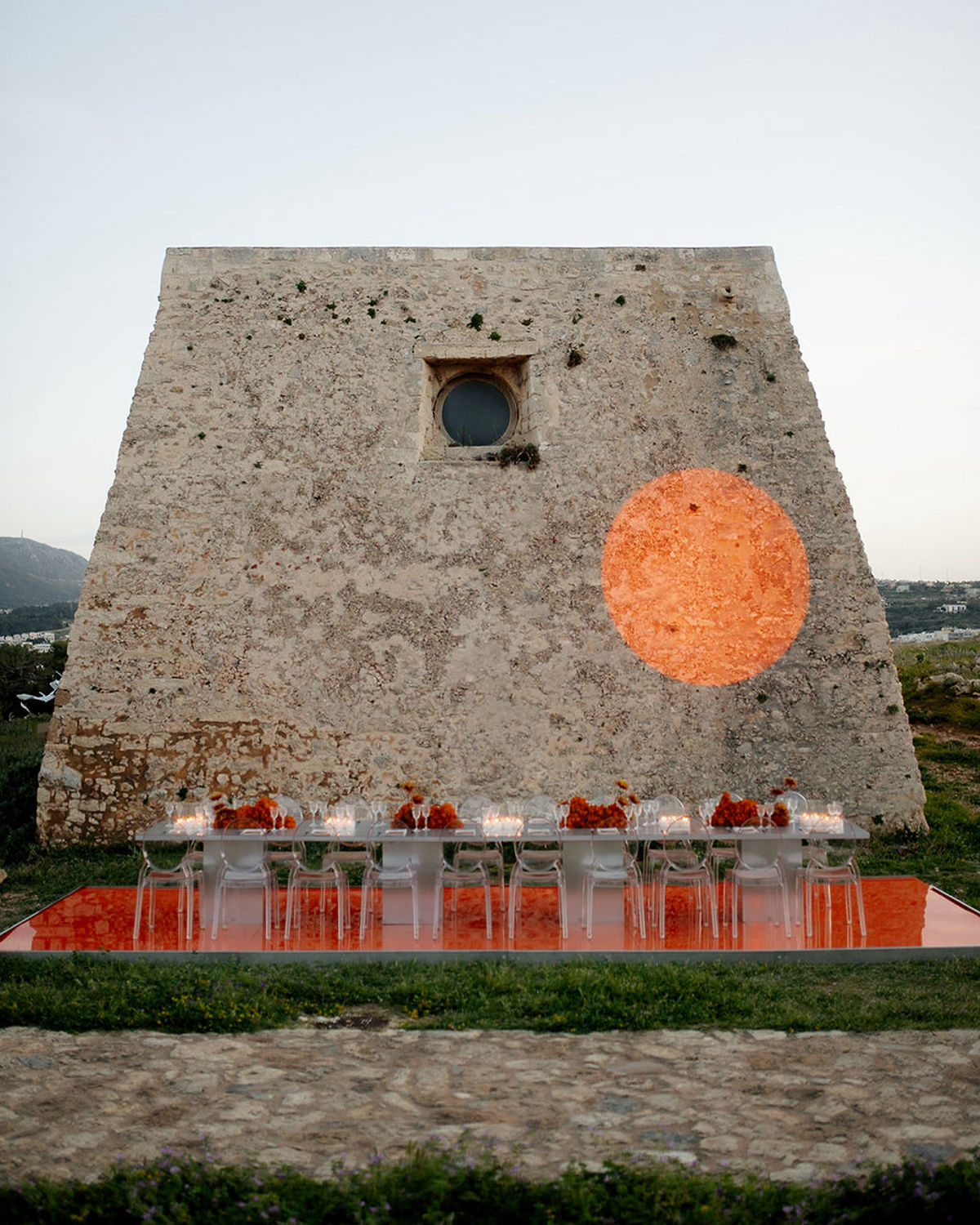 At the heart of it all is a couple, whose quiet intimacy is framed by a beautiful honey-ochre limestone that pairs perfectly with orange tones of floral comopsitions. Light becomes its own language here. A sculptural LED ring encircles the couple in a modern halo, and a projected orange moon casts a tender glow—part celestial, part cinematic. These bespoke installations do more than illuminate the space, they hold the emotion in place, casting romance as something sacred and enduring.
