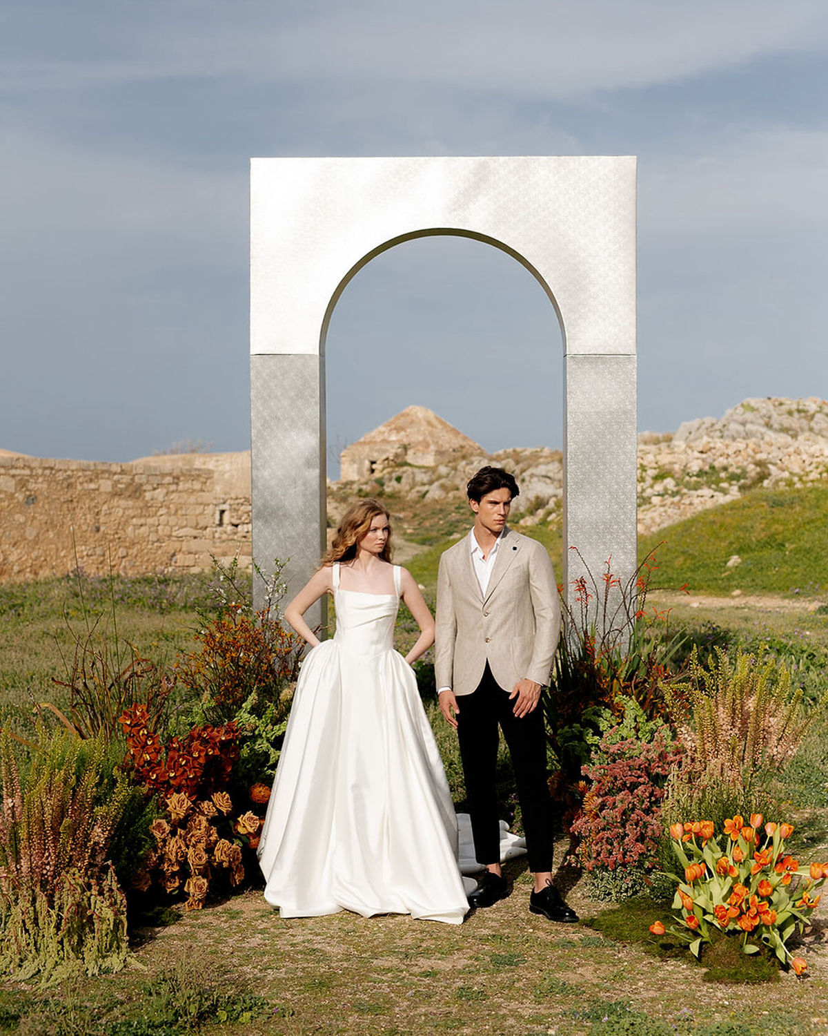 Set against the storied grounds of the Acropolis of Rethymno, this design-forward editorial reframes the ancient fortress not as a relic of the past, but as a canvas for connection and romance. Inspired by the Fortezza Fortress’s three distinct historical phases, Gigi & Roses envisioned a series of immersive setups, each echoing a different chapter of the site’s layered legacy, while inviting a contemporary love story to unfold among the ruins.