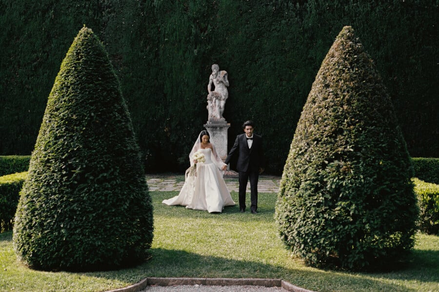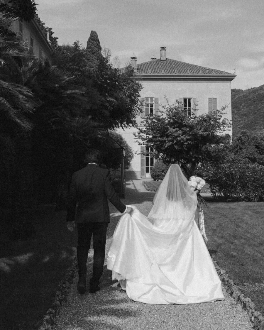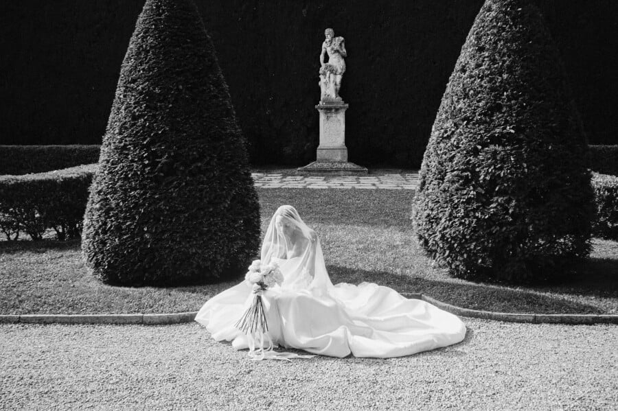 Kirsten and Jake’s Lake Como elopement feels like a study in contrasts – intimate yet cinematic, deeply personal yet visually striking in every detail. Their choice of Villa Pizzo brings a quiet grandeur: historic walls, lakefront light, and layered gardens shaping the rhythm of the day. The design leans into a chic Italian mood with a subtle gothic edge – moody tones, romantic florals, and a sense of intentional restraint that lets each setting speak. Inside the villa, the ceremony carries a dramatic softness, elevated by live violin. Kirsten’s look anchors it all: a Floure gown that balances structure and fluidity, paired with a long, statement veil that moves effortlessly through each scene. There’s a feeling of stillness, of time stretching just enough to hold every glance and vow. Captured by our member Georgia Grace, the day reads as both refined and instinctive. Their celebration continued later with a civil ceremony and a backyard dinner shared only with their closest circle – an extension of the same honest, thoughtful approach that defined it all.