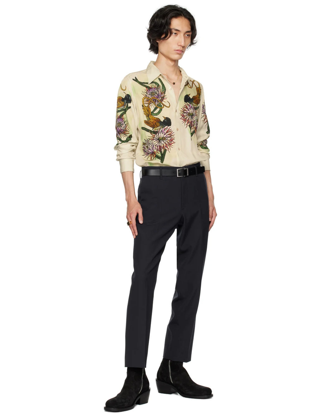 Dries Van Noten Printed Shirt, $720, and Navy Creased Trousers, $610