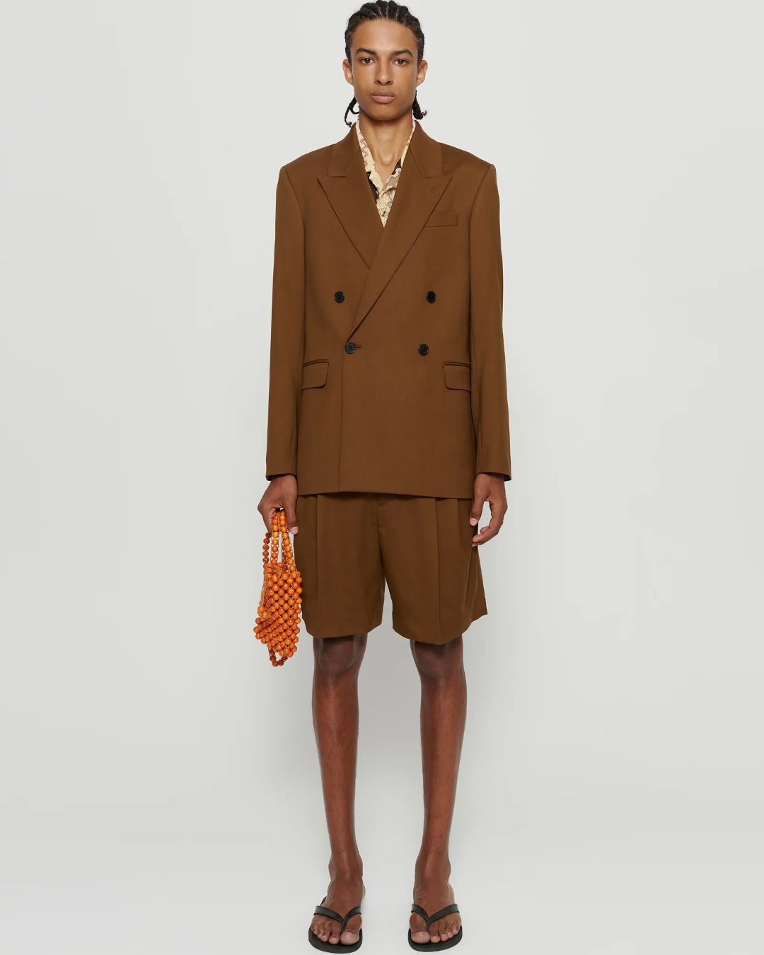 Cmmn Swdn Brown Vigar Blazer, $379, and Manson Pleated Shirts, $321