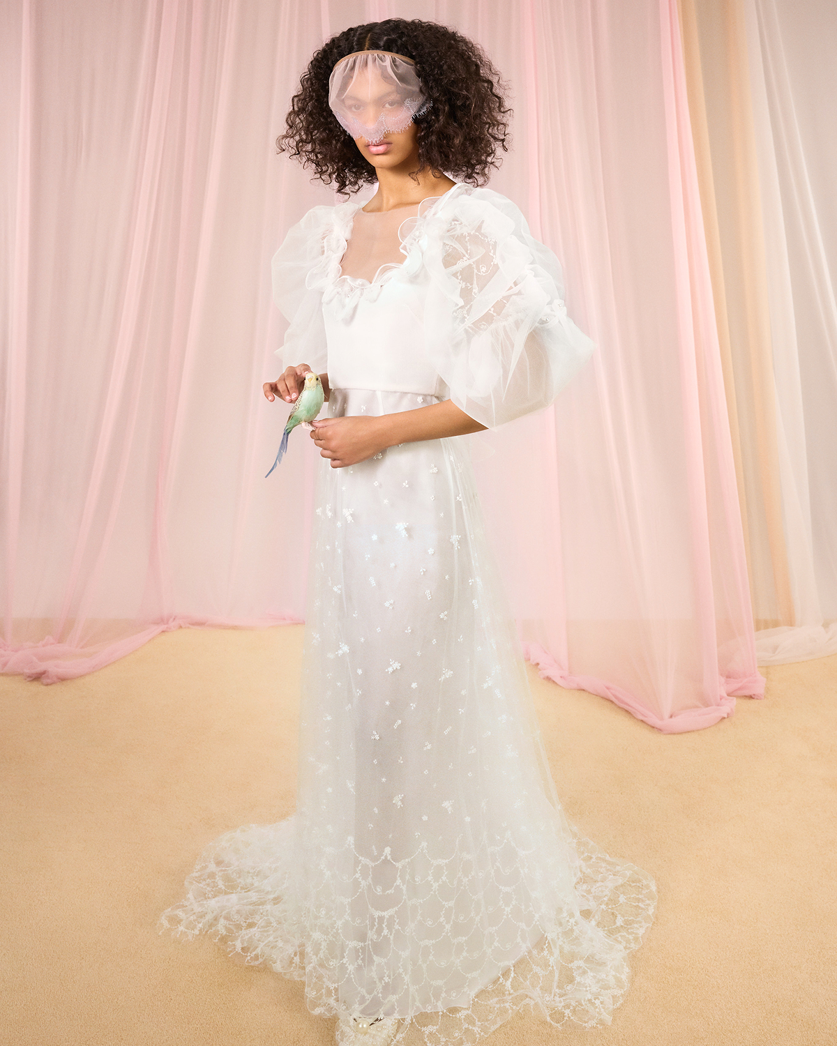 Randall’s creative process this season celebrates the parallels between couture and confectionery with two of the arguably most important elements of any wedding: the dress and the cake. Emphasizing the hands-on skills and techniques that define both worlds, these parallels are told through cascades of ruffles, scalloped accents and edges, and embroidered motifs reminiscent of sugar dustings create a visual feast. In place of fondant and frosting, she worked with silk, organza, and tulle, layering them in sculptural formations that mimic the tiered grandeur of a wedding cake.