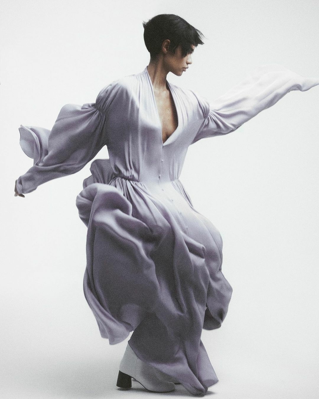 Pay attention to the cut. The clothes' silhouette should be loose and rounded. This way you can smooth out the "sharpness" that is common for a skinny body type. Apparel with shoulder pads, sharp deep necklines, and straight skirts might be a failure. Instead opt for minimalistic A-silhouette dresses, high-collared attires, or puffed gowns.