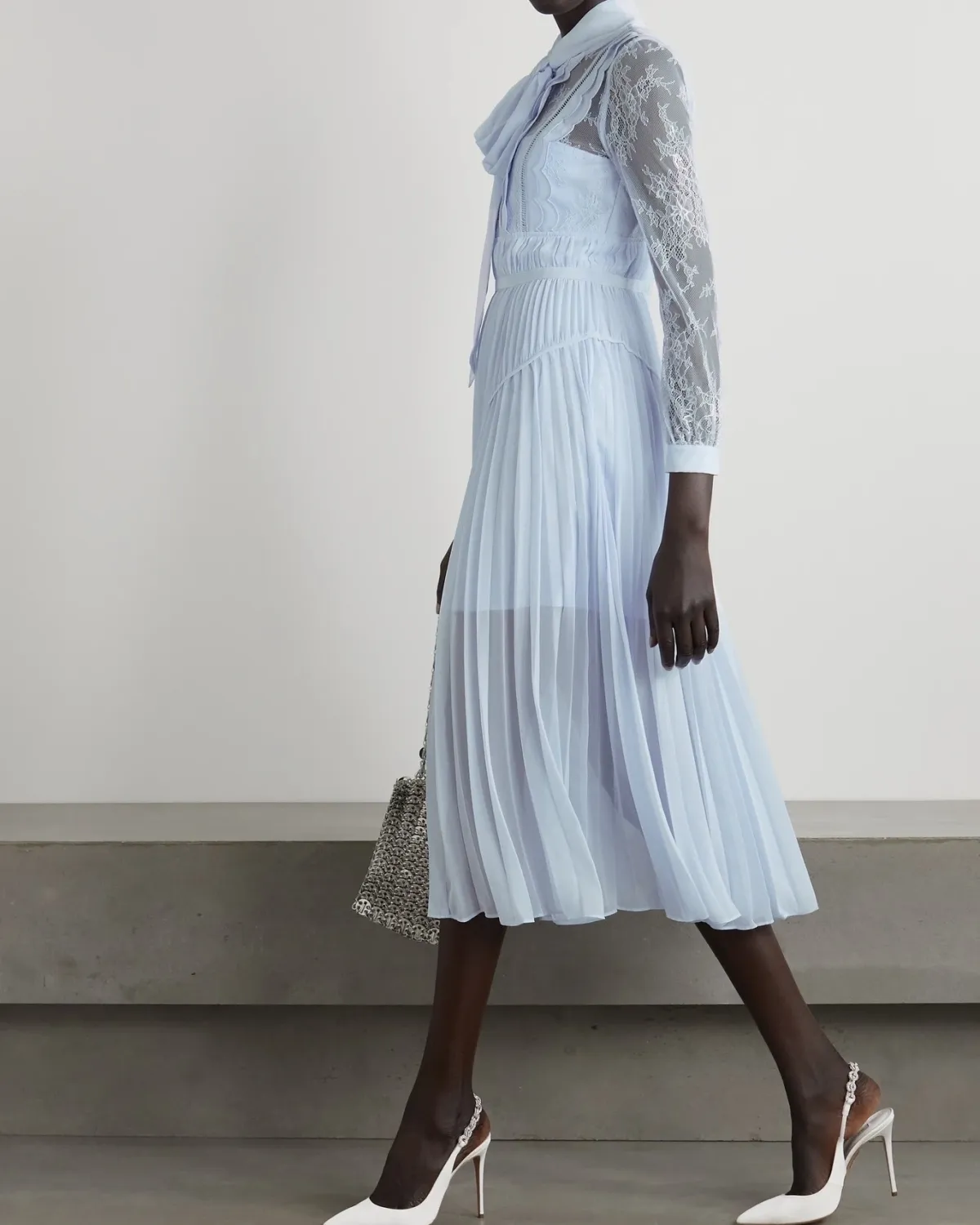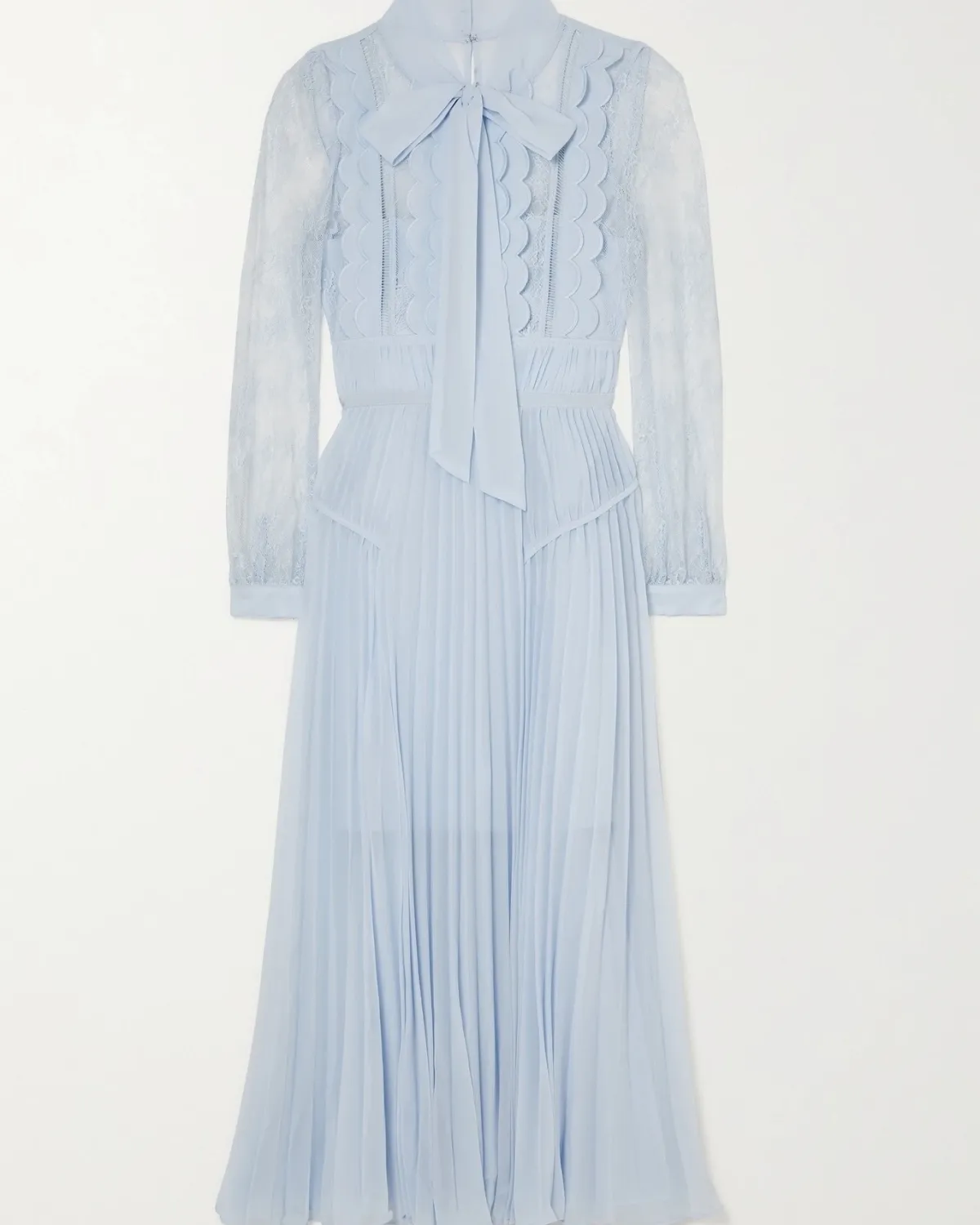 SELF-PORTRAIT Pussy-bow pleated lace and chiffon midi dress, $540