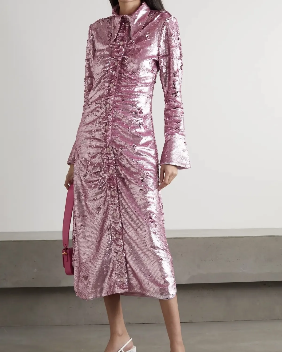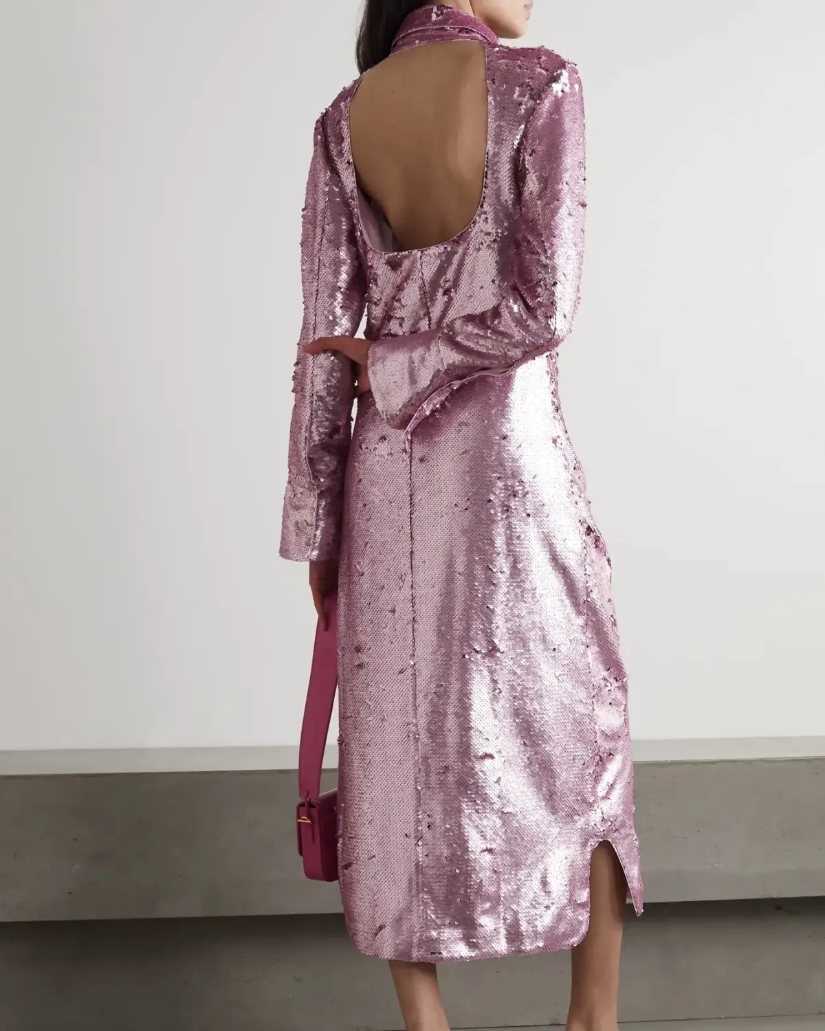 GANNI Open-back sequined recycled satin midi shirt dress, $695