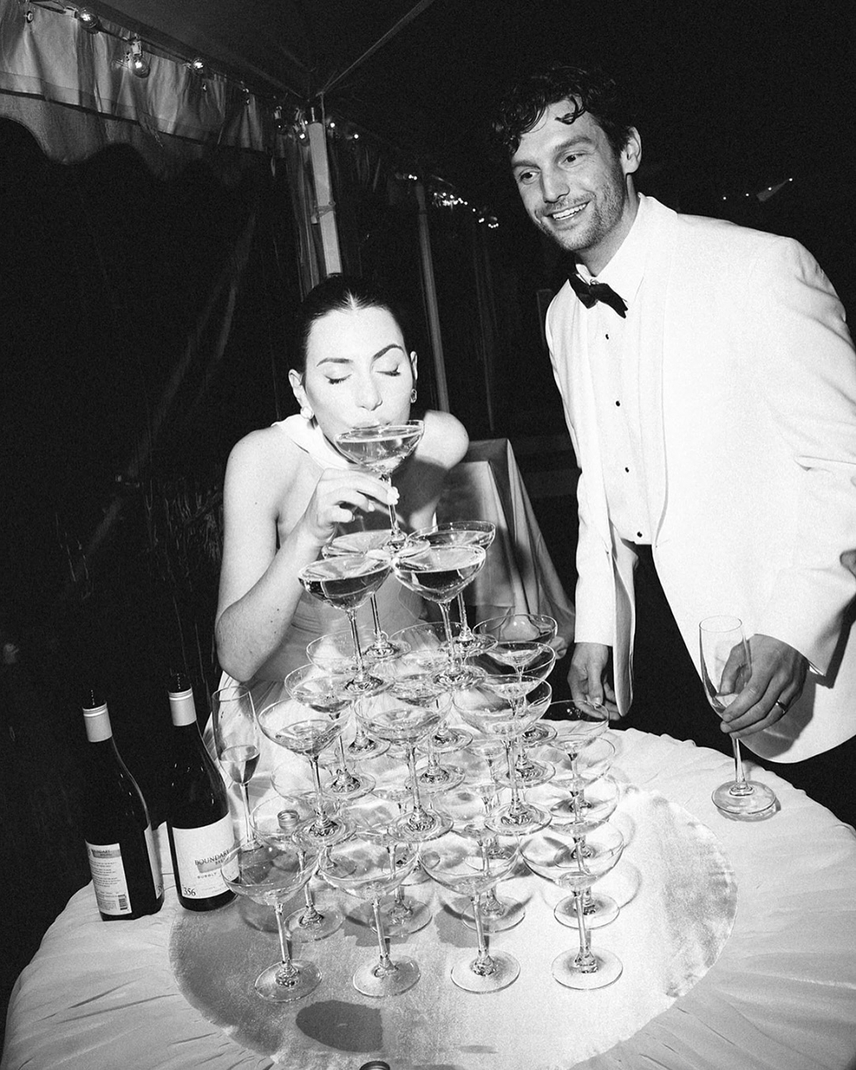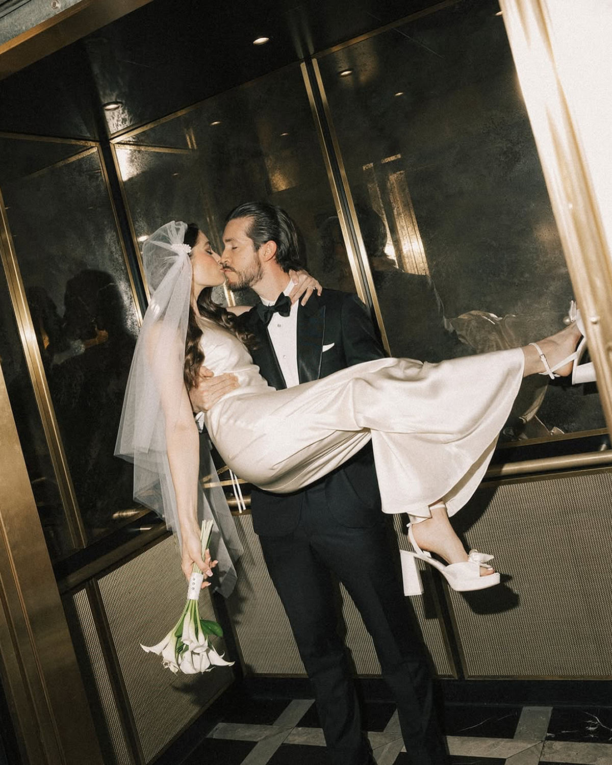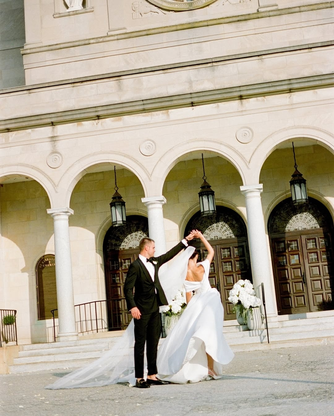Don’t stress too much if your dress gets a little dirty, it’s bound to happen. My advice? Wear the heck out of it and keep moving! Most brides I work with want to stay clean and polished before walking down the aisle, which is totally reasonable. In that case, I would suggest breaking up your photo sessions throughout the day—taking some low-key photos with less movement before the ceremony, then going all-in with funky editorial and motion-driven images after the ceremony. I’m also a fan of leaving the dress and veil as they are, without nonstop “fixing.” Constantly fussing over the dress and trying to make everything look perfect takes away from special moments, making it feel more staged.