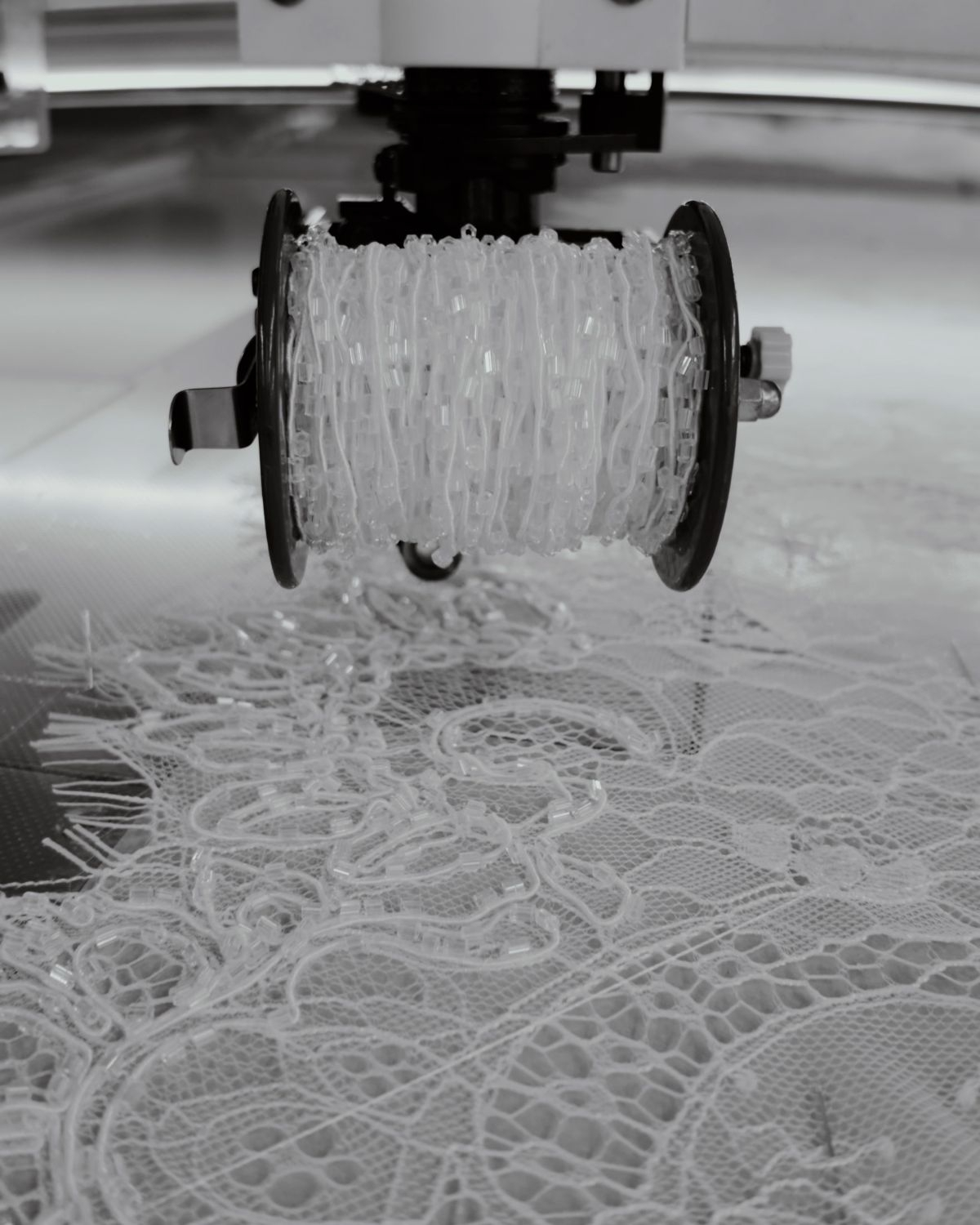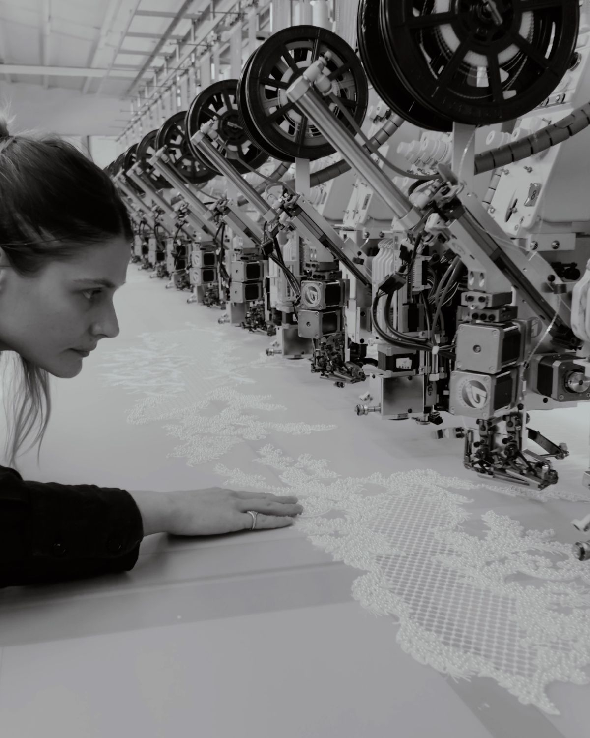Each dress tells its own story. I listen to what the dress needs. If the materials exist in my atelier, I reuse and reshape them. If not, I begin a long process of research—online, walking, swimming, reading—to find or create what the dress requires. In our embroidery atelier, I share the story, the emotion, or the abstract shape I want, and our team draws it. Then we use software to convert those drawings into embroidery files. We create samples, and once I see them in fabric, I figure out how to apply them to a dress. It can take days or months. But the combination of tech, craft, and our incredible team always brings the piece to life.