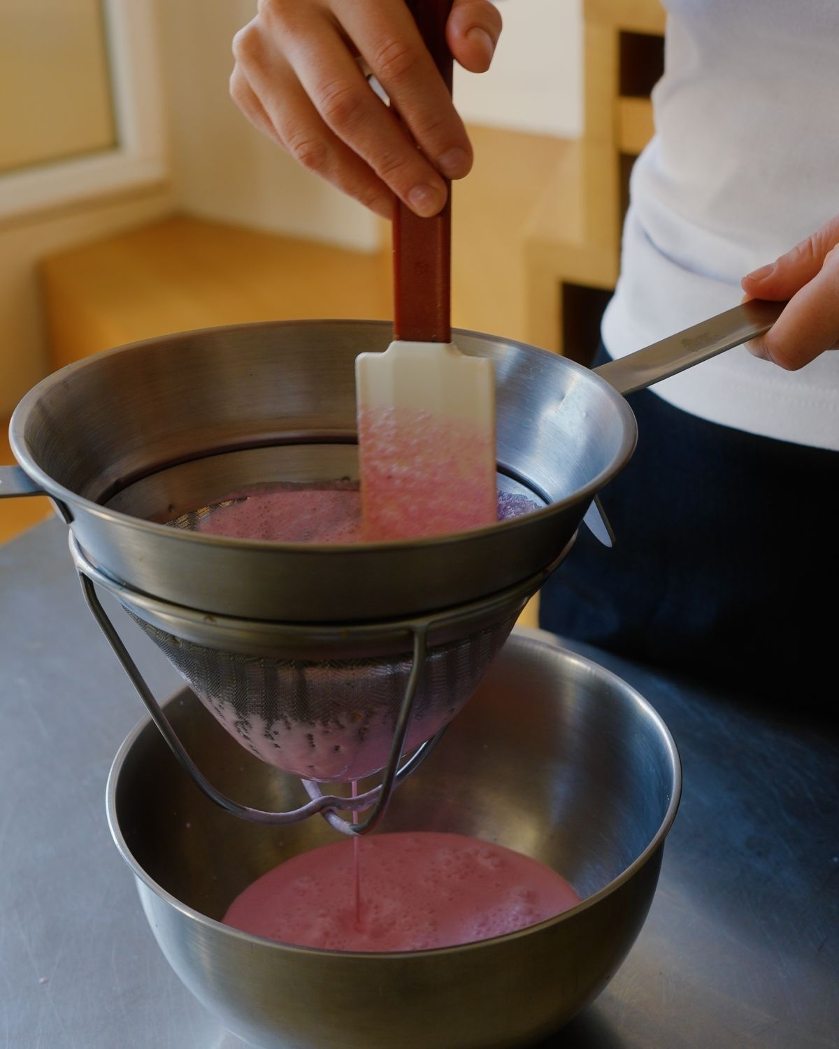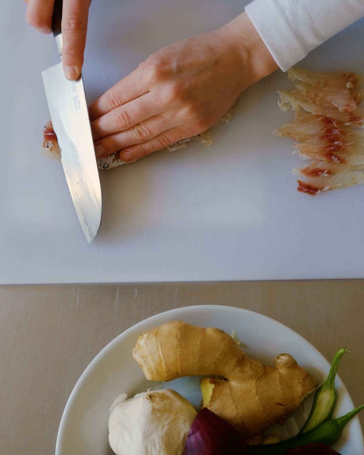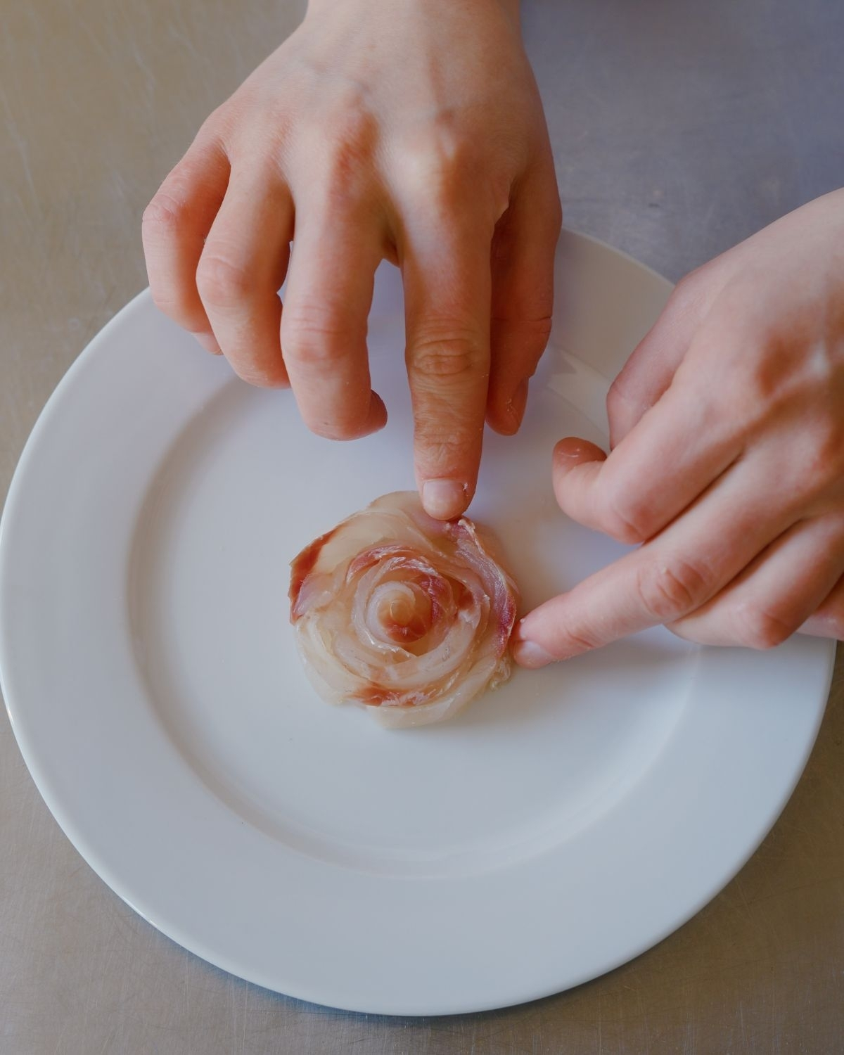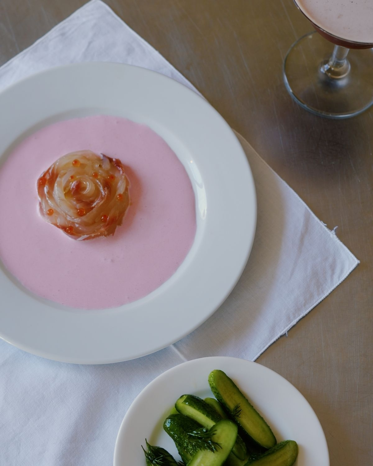 In the Baltics we have this pink soup that is made with kefir lime, beetroot, fresh herbs and cucumber. It’s an extremely simple dish, but is anything but ordinary. I spent some time refining and transorming the dish, finding new ways to cook it that honors the bold color, while changing up the ingredients. Today's verson is inspired by leche de tigre. The pink soup is quite spicy and packs a bit of punch, full of lime, garlic and red onion, so is beautiful to serve with a fresh fish. I chose a sea bream today, sliced and arranged into a blooming flower.