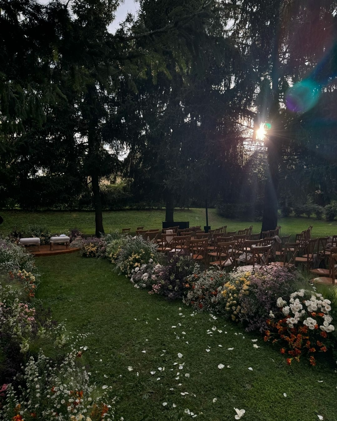 Veronica made her grand entrance in a romantic, short-sleeved wedding gown, later changing into a shimmering dress for the reception. Davide went classic with a timeless black suit and bowtie, looking effortlessly handsome.