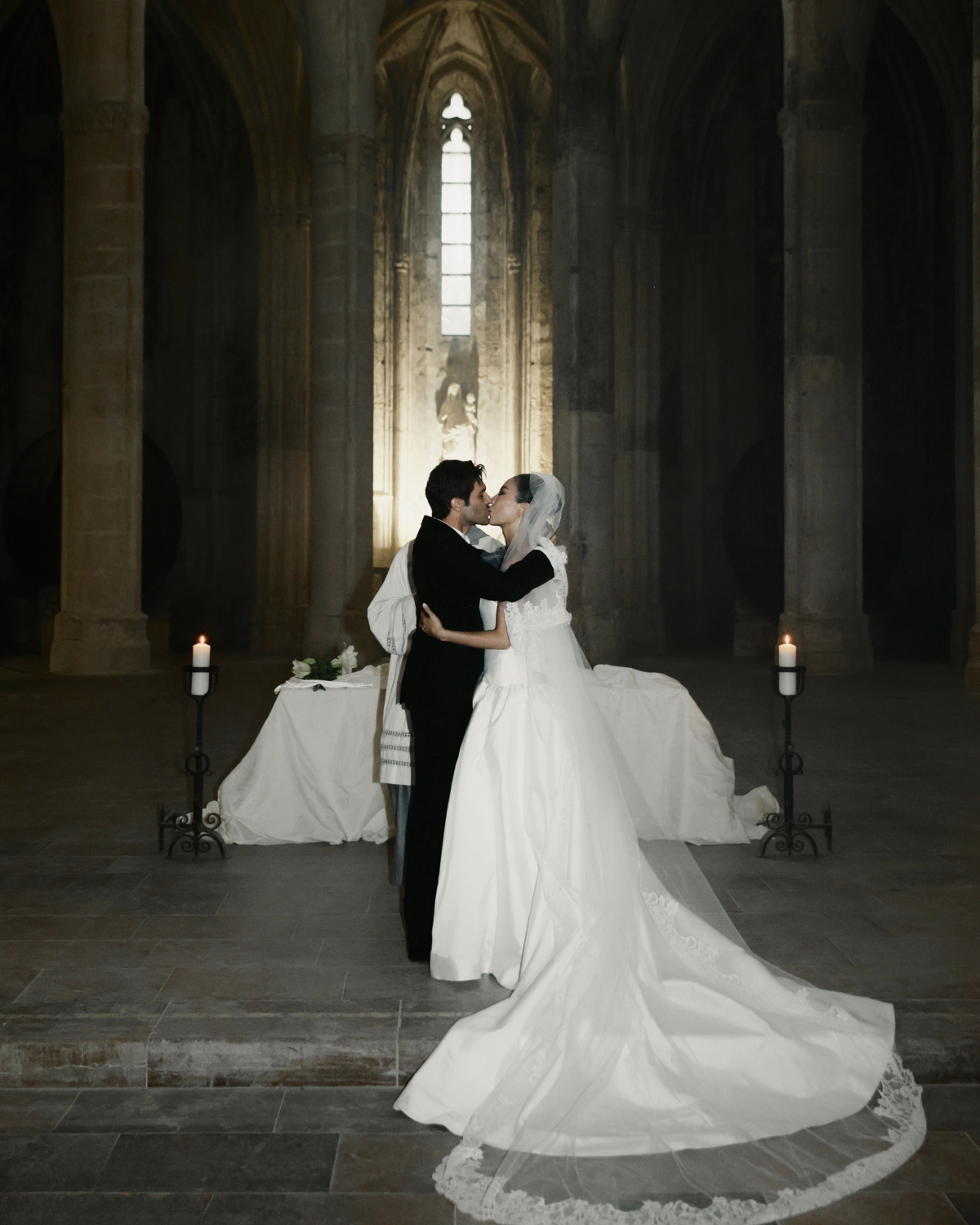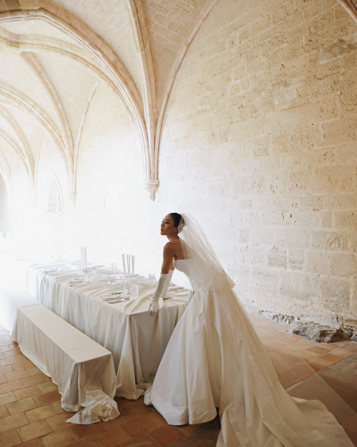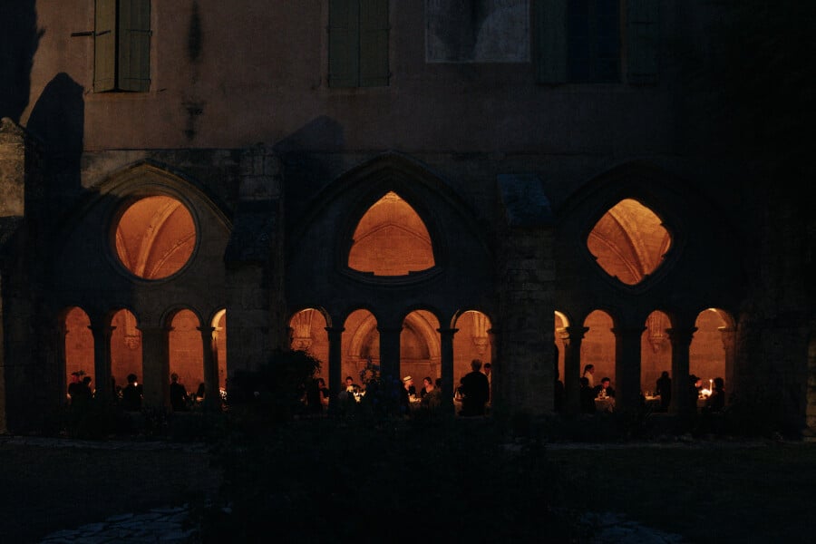The venue was a cornerstone of the wedding’s success. It was the most time-consuming part of the planning (six months), because the entire story was meant to unfold from the space. At first, we imagined a ceremony and dinner inside the ruins of a historical building. But the risk of unpredictable weather made us reconsider. We then looked for a Cistercian abbey, since they’re often stripped of all ornamentation and offer the kind of raw minimalism we love. After a little tour of France, we visited the Abbaye de Valmagne, in the South of France near Montpellier. And it was love at first sight: nestled in the countryside among vineyards, an ancient church with 25-meter-high ceilings, a cloister still pulsing with spiritual energy in every stone… and most importantly, the possibility of holding the entire wedding in one place, protected from the rain, open yet covered. It was perfect.