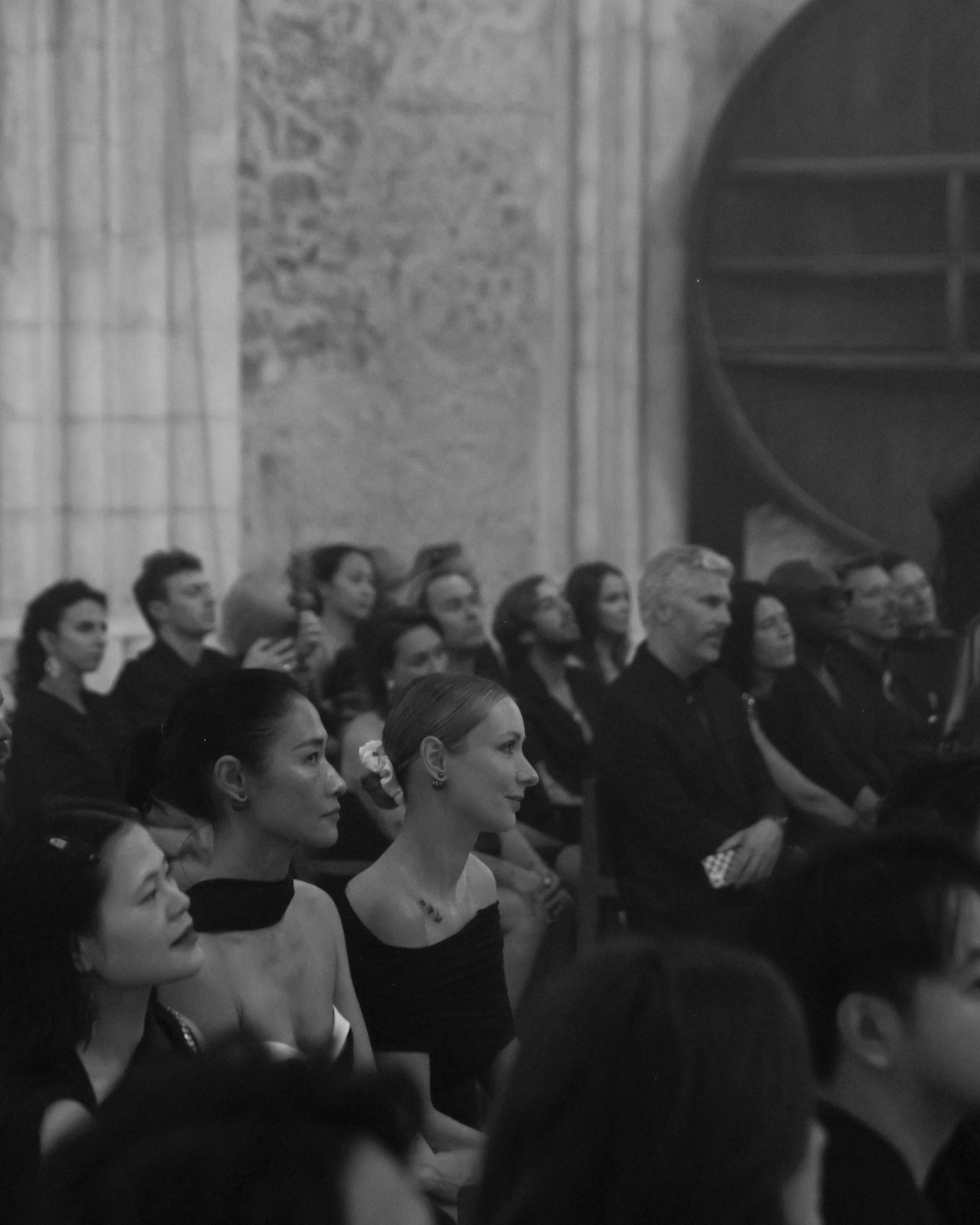 We wanted the ceremony to be highly visual, unexpected, and graphic—conceived almost like a mini-show with a precise lineup. We had timed the walk from the church entrance to the altar: approximately 1 minute and 30 seconds. Long enough to make the entrance feel powerful and emotionally charged. Once the guests were gathered around the altar with the priest, a solemn piece of music began: Stabat Mater, Fons Amorisby Vivaldi. Two figures were the first to walk down the aisle, dressed entirely in black, monk-like robes with hoods covering their faces, making them completely unrecognizable.