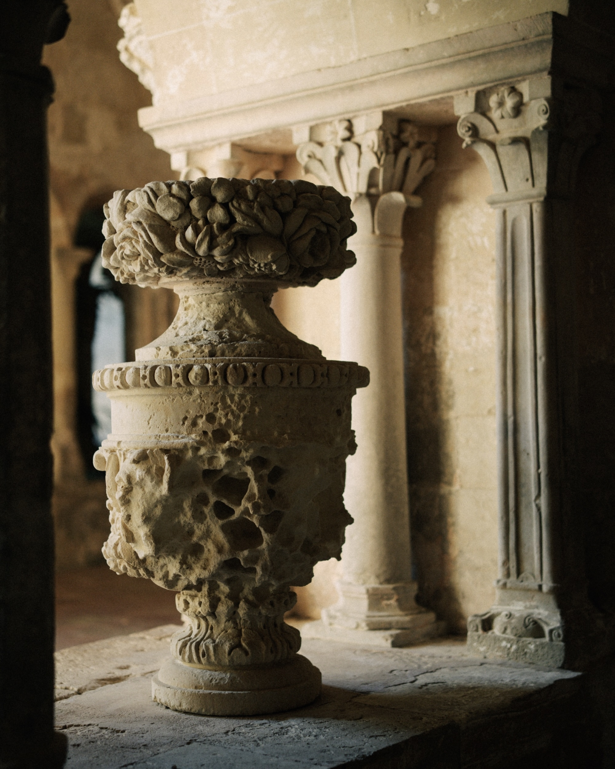 We envisioned the entire event as rich and continuous, without any downtime. So we decided to host a welcome cocktail before the ceremony, giving guests time to gather and settle in. It took place in the main courtyard of the abbey. Once the ceremony in the church had concluded, we moved into the cloister. After a few photos with our guests, it was time to begin the dinner.